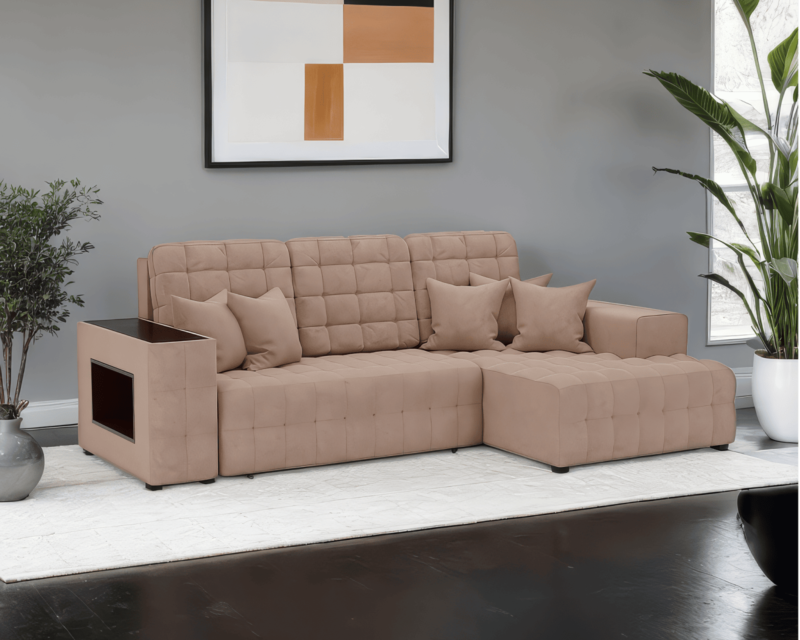 Удобство использования дивана «Мадрид» дополняется ящиком для хранения, который расположен внутри угловой части. В него можно положить небольшие вещи или постельные принадлежности, сохраняя порядок и экономя пространство.