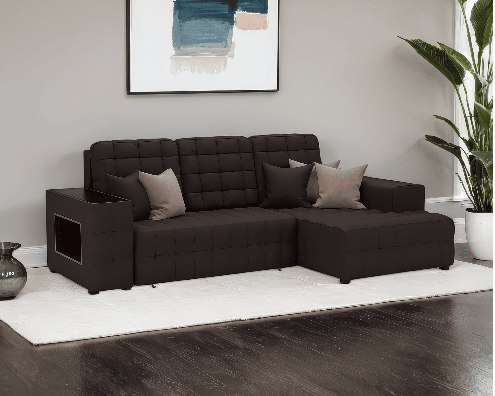 Удобство использования дивана «Мадрид» дополняется ящиком для хранения, который расположен внутри угловой части. В него можно положить небольшие вещи или постельные принадлежности, сохраняя порядок и экономя пространство.