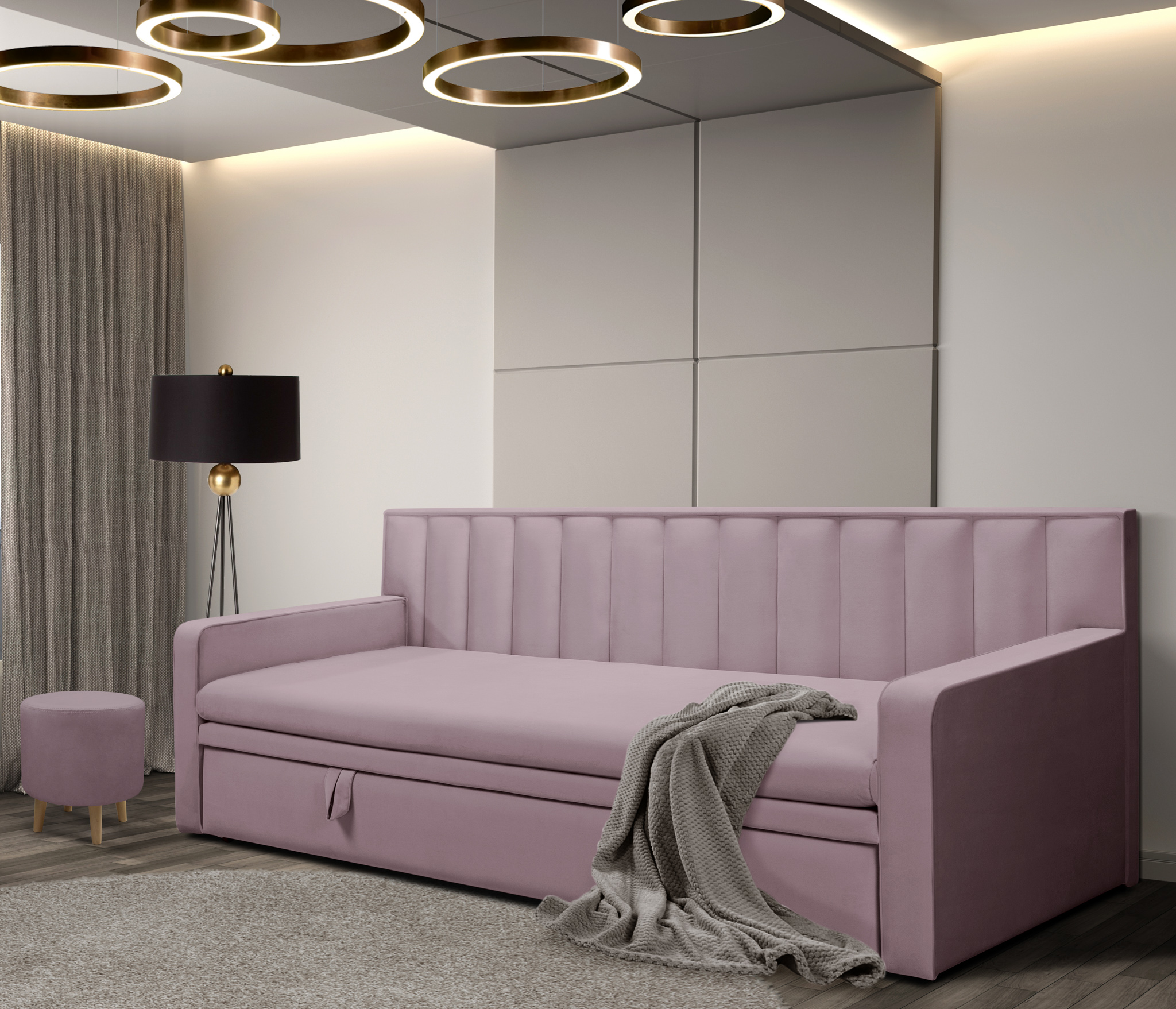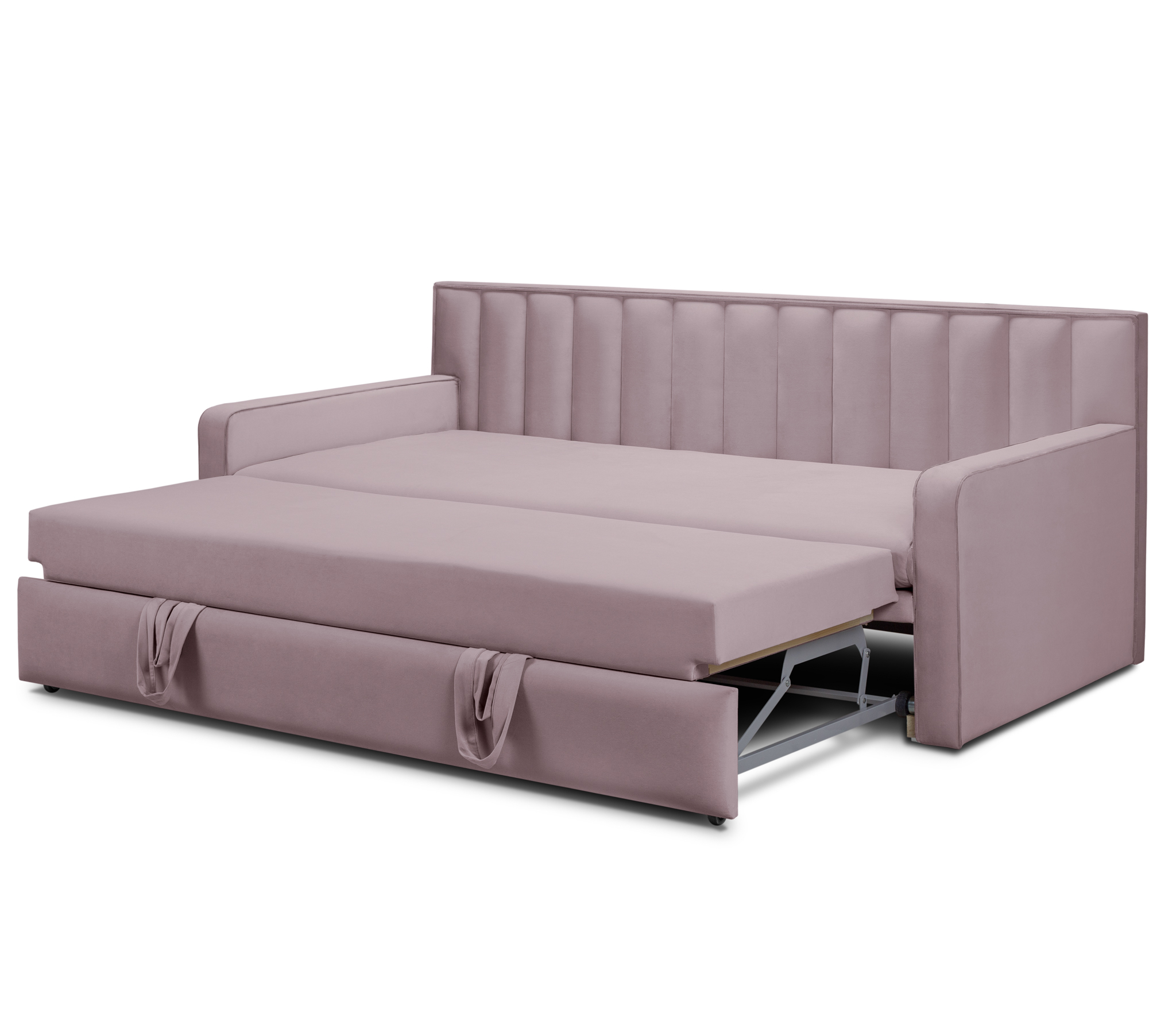Широкие боковины и особая техника раскладки позволяет использовать кровать днём, как стильный диван.