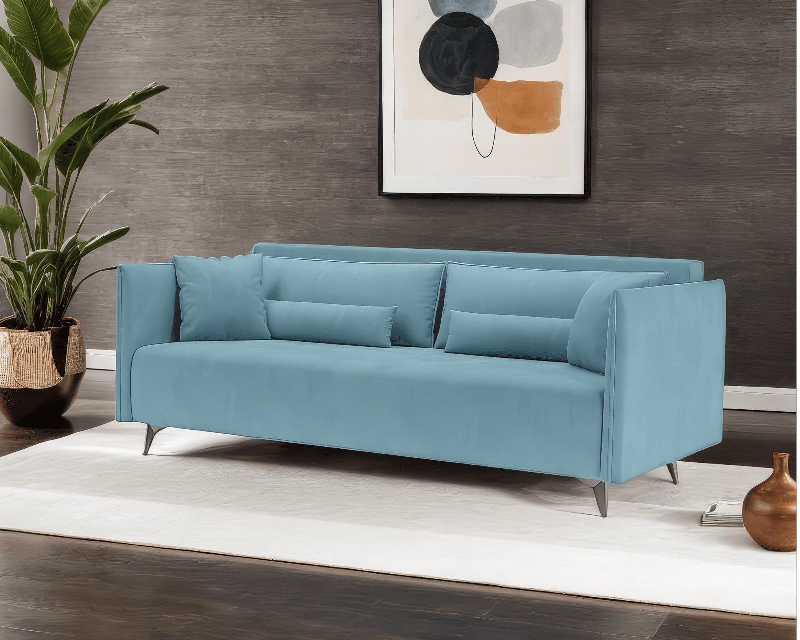2. Металлические ножки обладают высоким уровнем прочности и устойчивости. Модель на длинных металлических ножках выглядит легкой и изящной. Упрощается процесс уборки в помещении, так как увеличенное пространство между полом и диваном позволяет без лишних усилий убрать пыль и иные загрязнения.