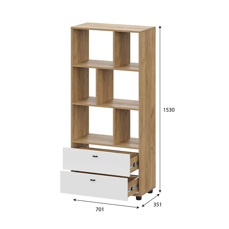 Сочетание открытых полок для книг и предметов декора и выдвижных ящиков - главный секрет функциональности стеллажа.