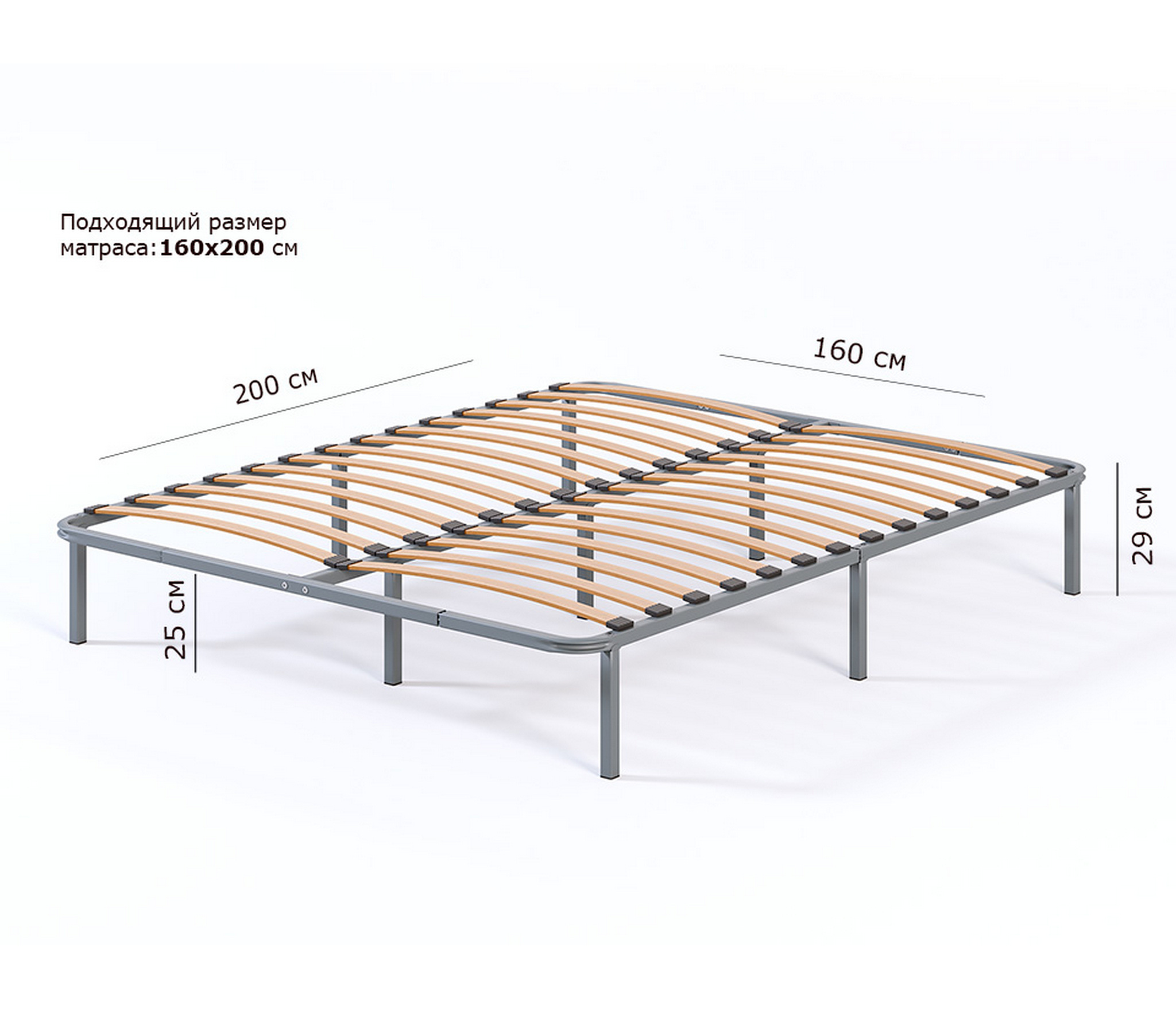 Разборная компактная двухспальная кровать металлическая без спинки с анатомическим основанием и держателями для матраса (2 шт.). Матрас в комплект не входит.
