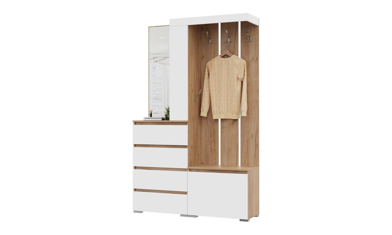 Комплектация прихожей «Хелен» включает в себя комод, зеркало, 4 выдвижных ящика с шариковыми направляющими полного выдвижения, удобные боковые полочки для мелочей, закрытую обувницу и открытые вешалки для верхней одежды. Важным акцентом модели является отсутствие ручек на фасадах, что создаёт лаконичность и цельность образа прихожей.