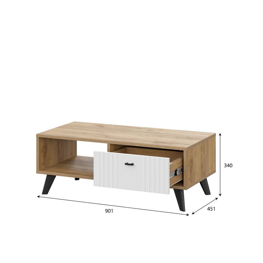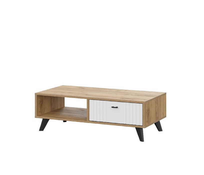 Оснащен открытой полкой и выдвижным ящиком.