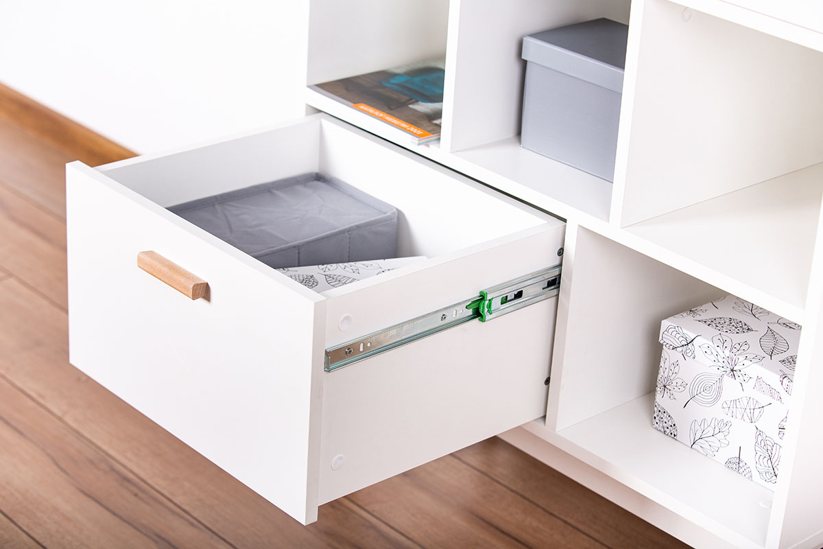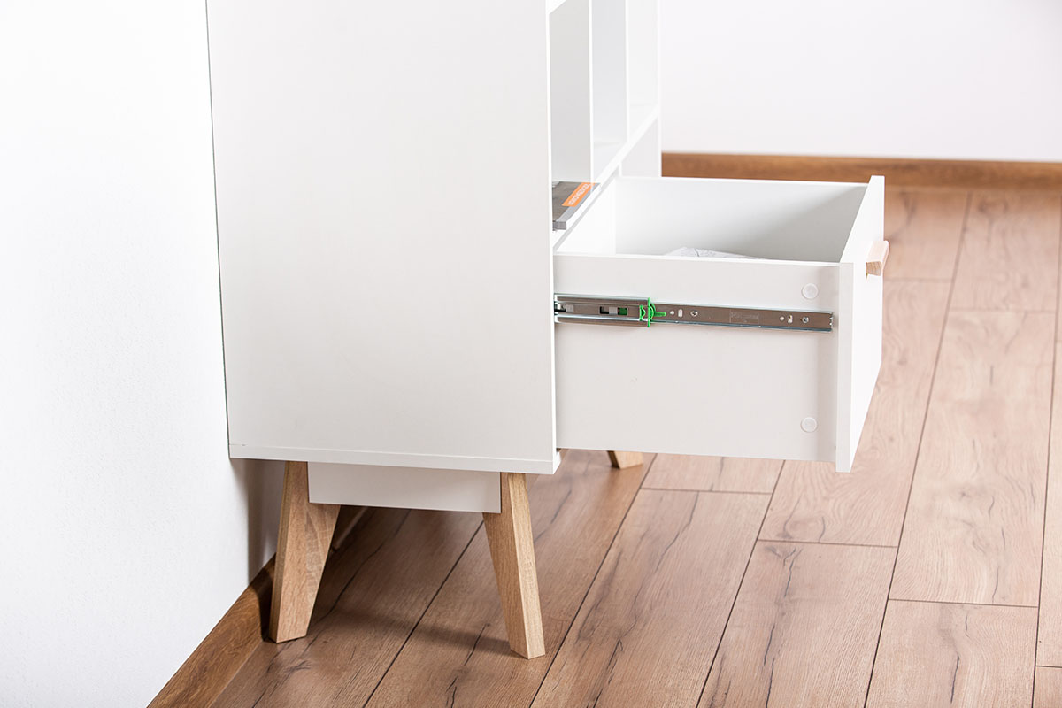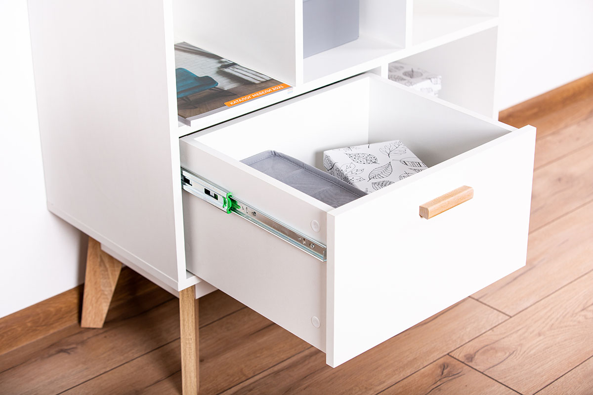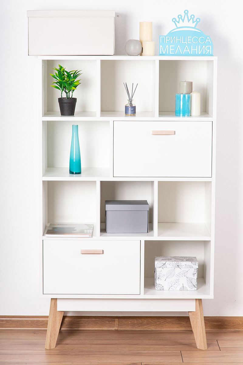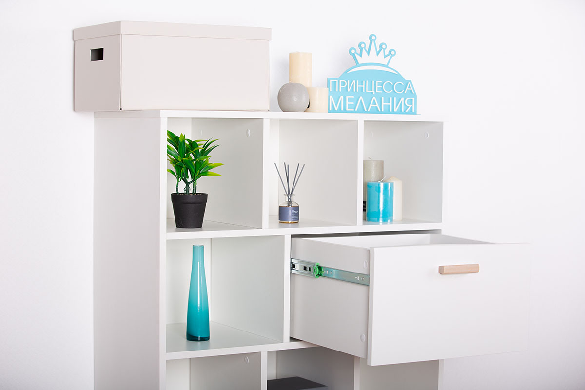 Глубина напольного комода узкая, всего 40 см, поэтому он займет минимум пространства и подойдет для малогабаритной комнаты или детской. В выдвижных деревянных ящиках можно разместить детские игрушки и одежду. На открытых полочках девочки могут расставить куклы, мальчики используют их как гараж для машинок, а школьники - как книжные. Если поставить комод в кухню, то хранение посуды и различных приспособлений перестанет быть проблемой, а если в гостиную - то на него можно установить и телевизор.
