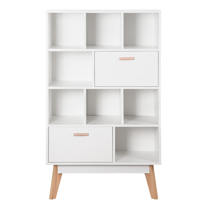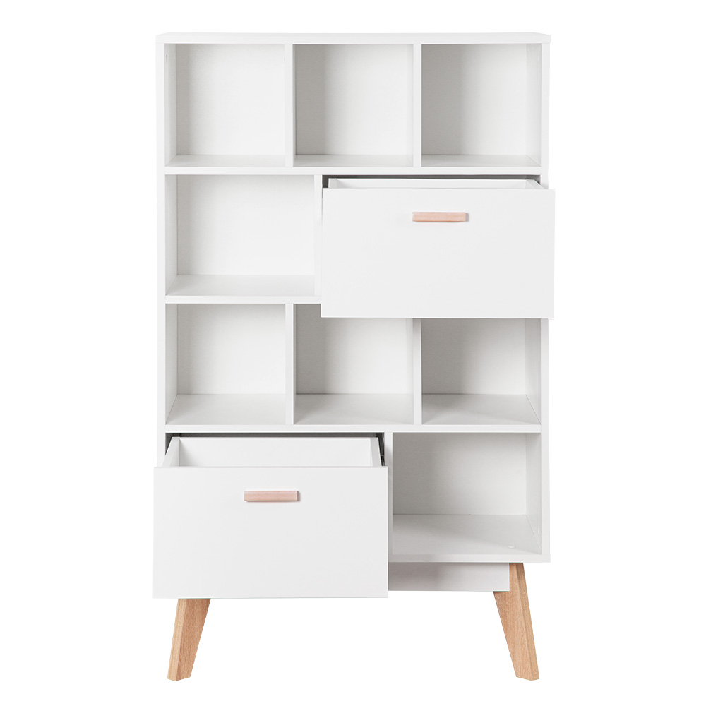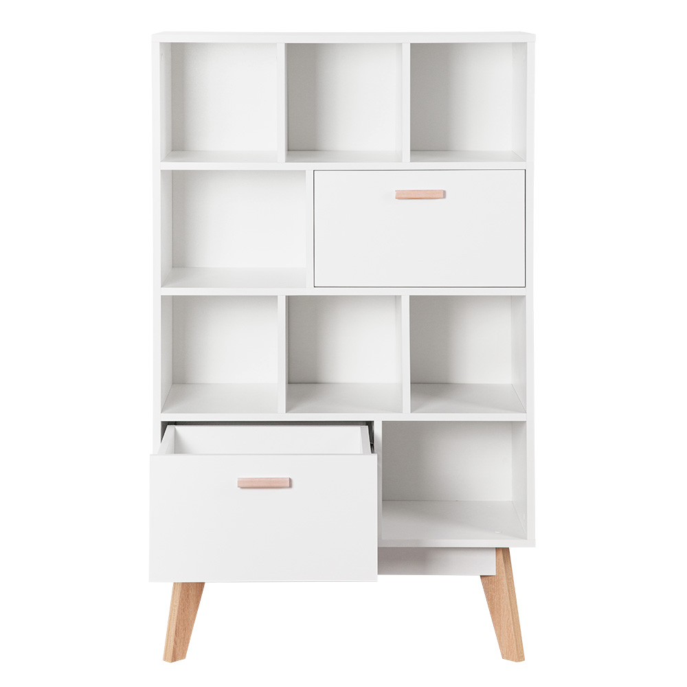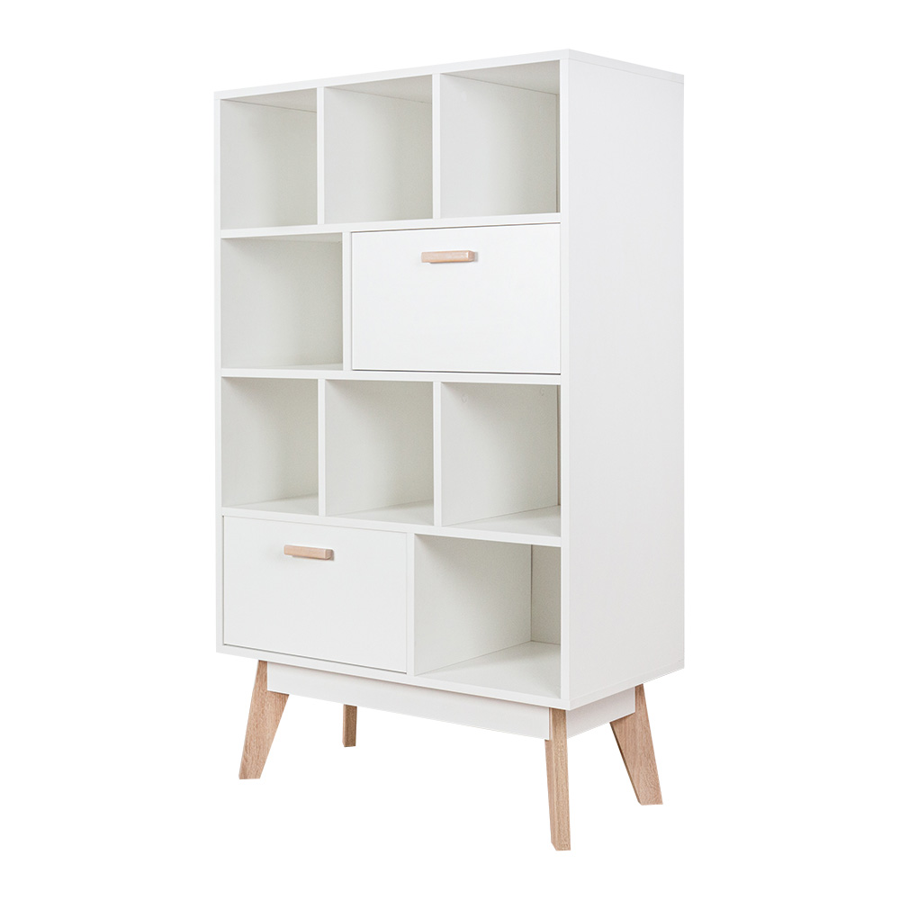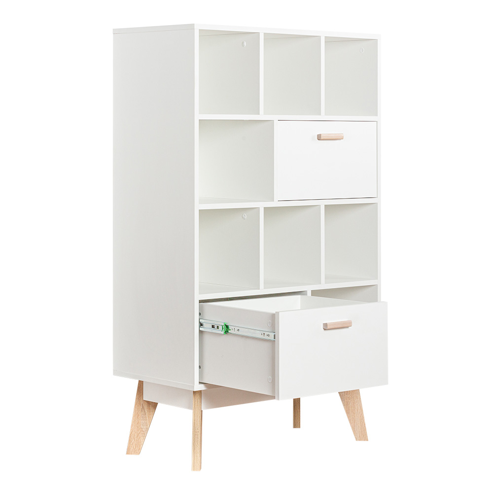 Глубина напольного комода узкая, всего 40 см, поэтому он займет минимум пространства и подойдет для малогабаритной комнаты или детской. В выдвижных деревянных ящиках можно разместить детские игрушки и одежду. На открытых полочках девочки могут расставить куклы, мальчики используют их как гараж для машинок, а школьники - как книжные. Если поставить комод в кухню, то хранение посуды и различных приспособлений перестанет быть проблемой, а если в гостиную - то на него можно установить и телевизор.