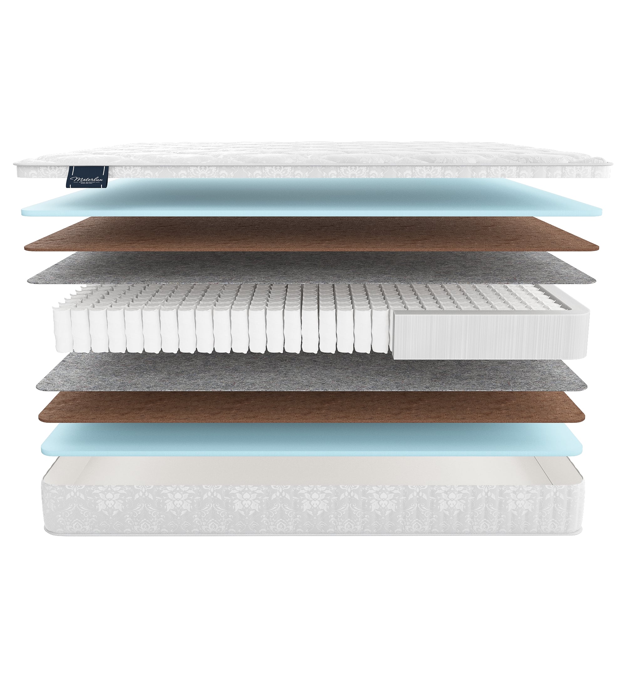 ● Feltro Termico — плотный термофиксированный фетр из шерсти и хлопка. Мы прокладываем слой фетра между пружинами и наполнителями. Материал защищает слои от давления пружинами, поэтому матрас служит дольше, сохраняет упругость и ортопедические свойства.