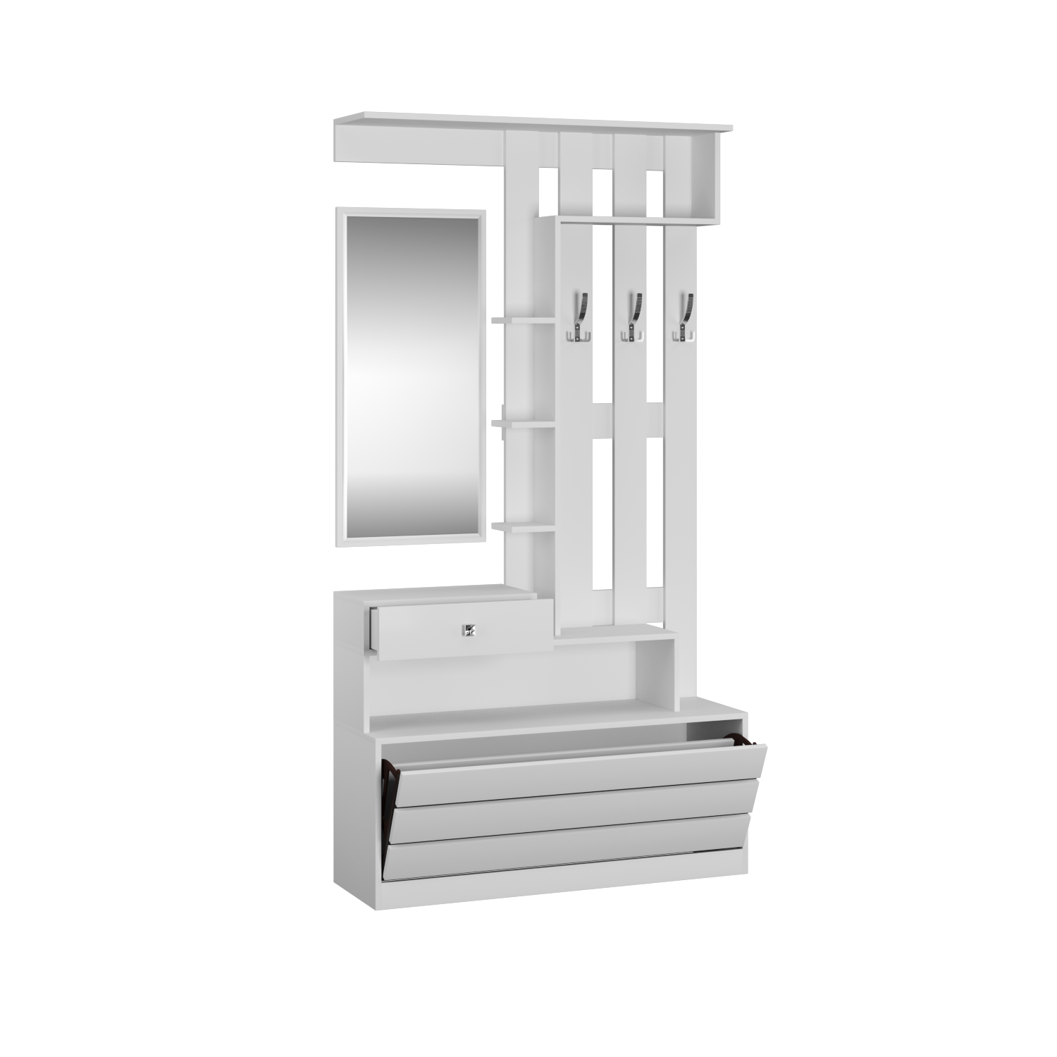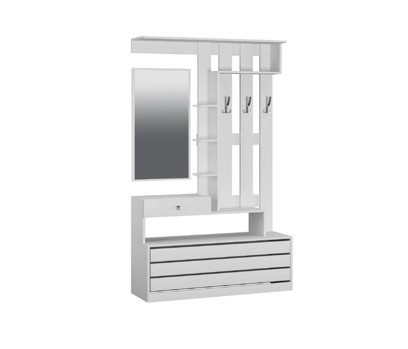 Модуль уникален по своей функциональности и содержит нишу для обуви с откидной дверцей, выдвижной ящик для мелочей, открытую вешалку с 3-мя крючками, полку-антресоль, набор открытых полок и зеркало.
