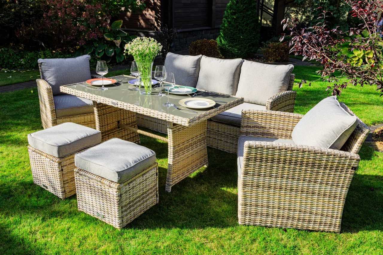 При всем этом мебель имеет небольшой вес, что позволяет с легкостью перемещать ее с места на место. Комплект дополнен мягкими подушками с чехлами из водоотталкивающей ткани.