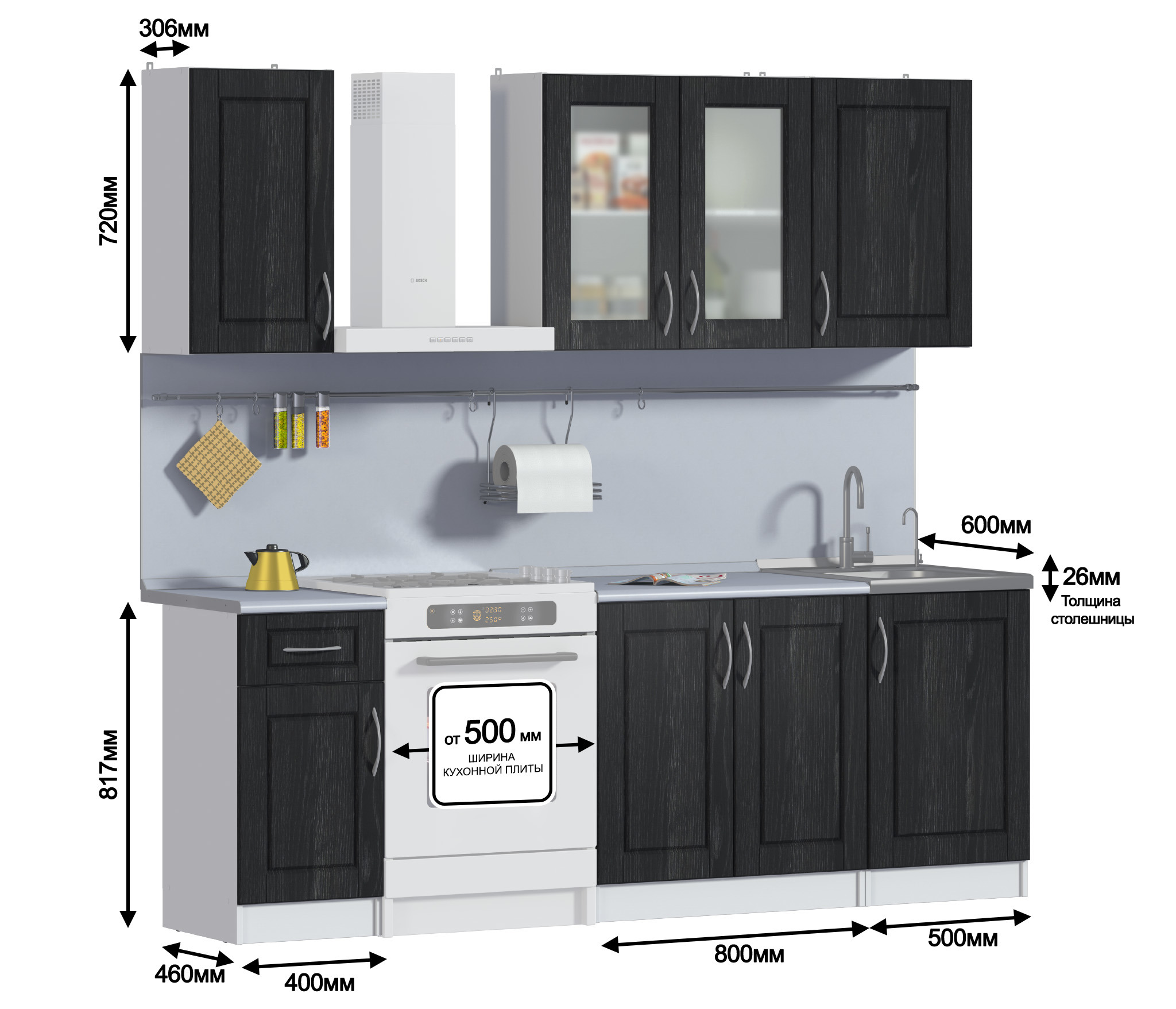 Полка 400, Полка- ветрина 800, Полка-сушка 500, Стол 800, Стол с дверью и ящиком 400, Стол-мойка 500. Столешница входит в стоимость кухни - цвет Серебро.