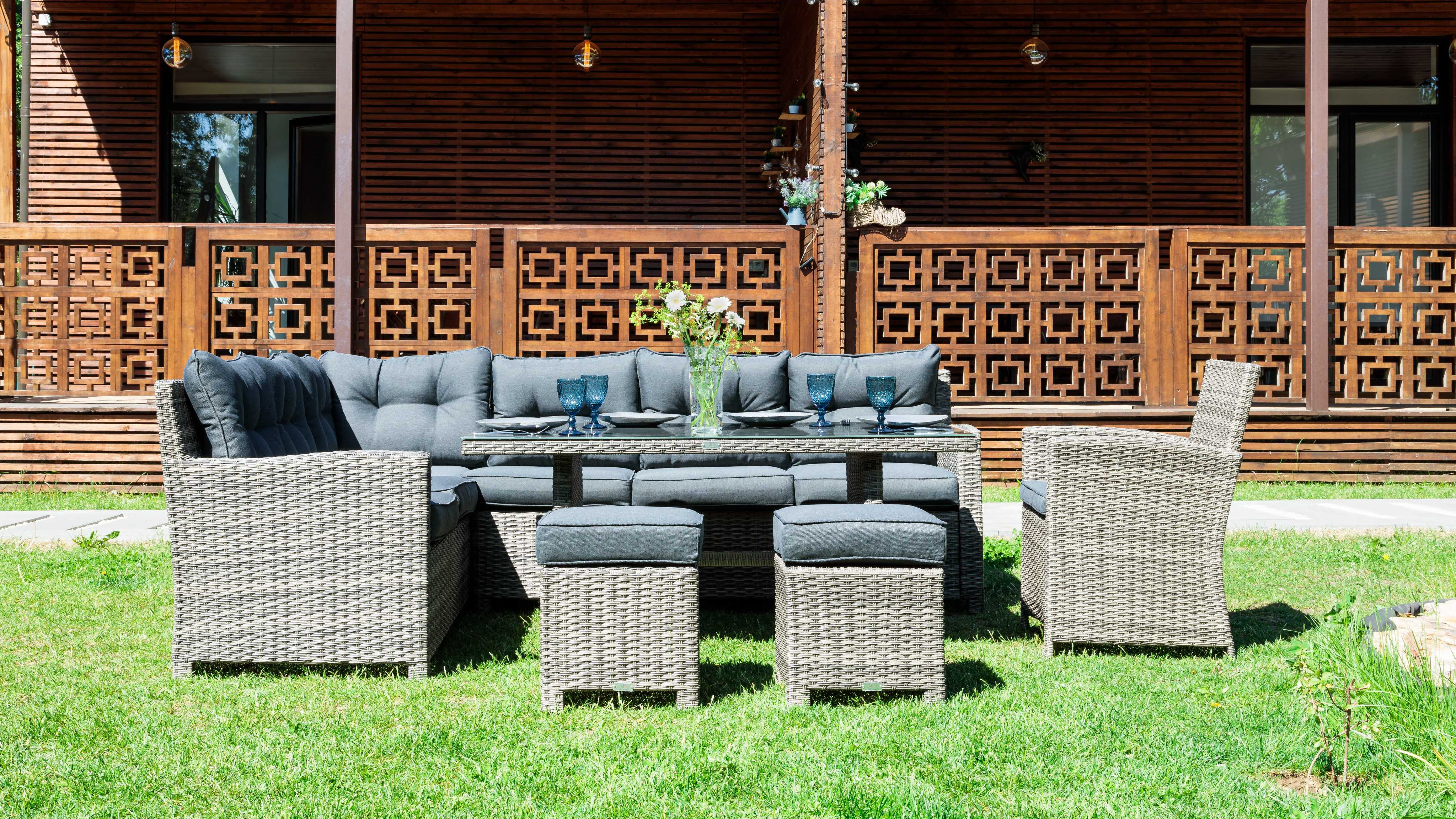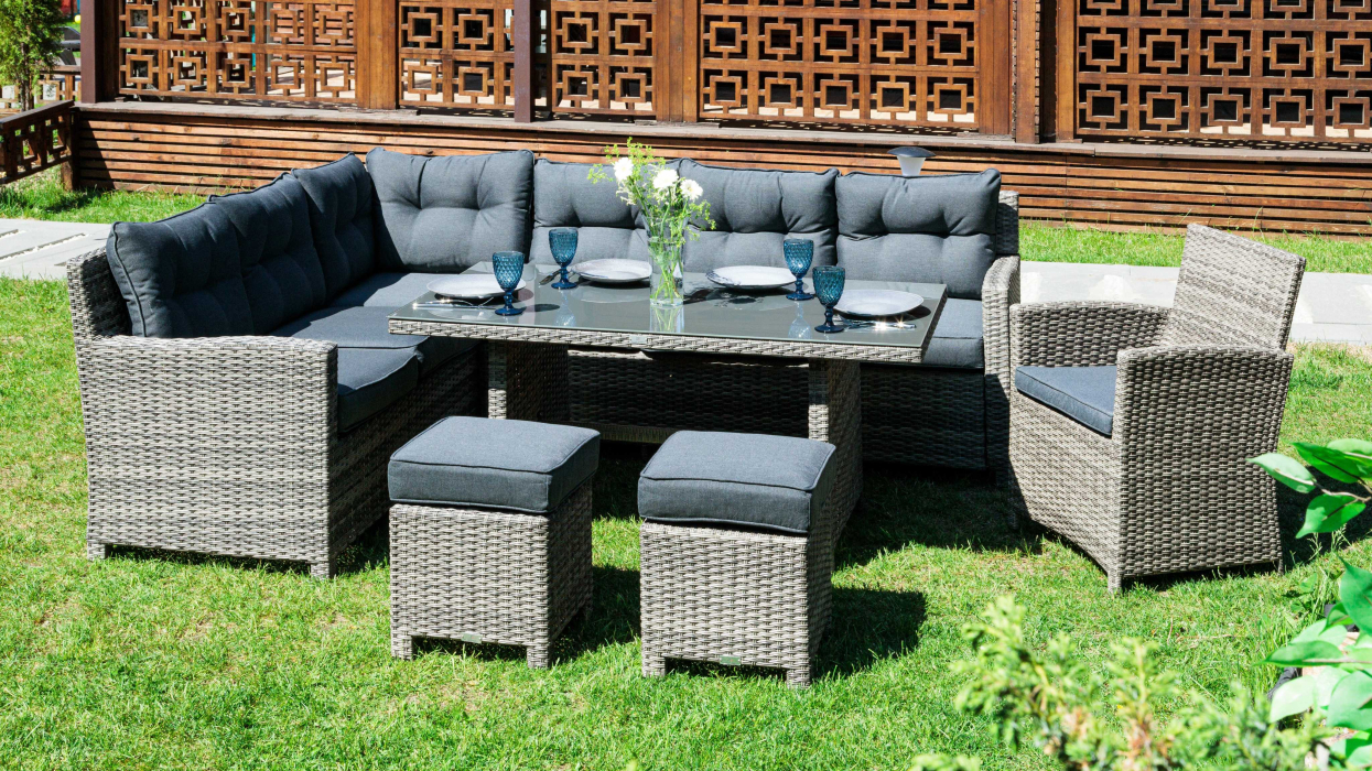 Угловой комплект уличной мебели Genry станет отличным решением для всех, кто предпочитает полноценный летний досуг на территории придомового участка. Ключевая особенность набора заключается в его габаритах, которые обеспечивают возможность его применения не только для семейного досуга или трапез, но и времяпровождения в большой компании друзей.