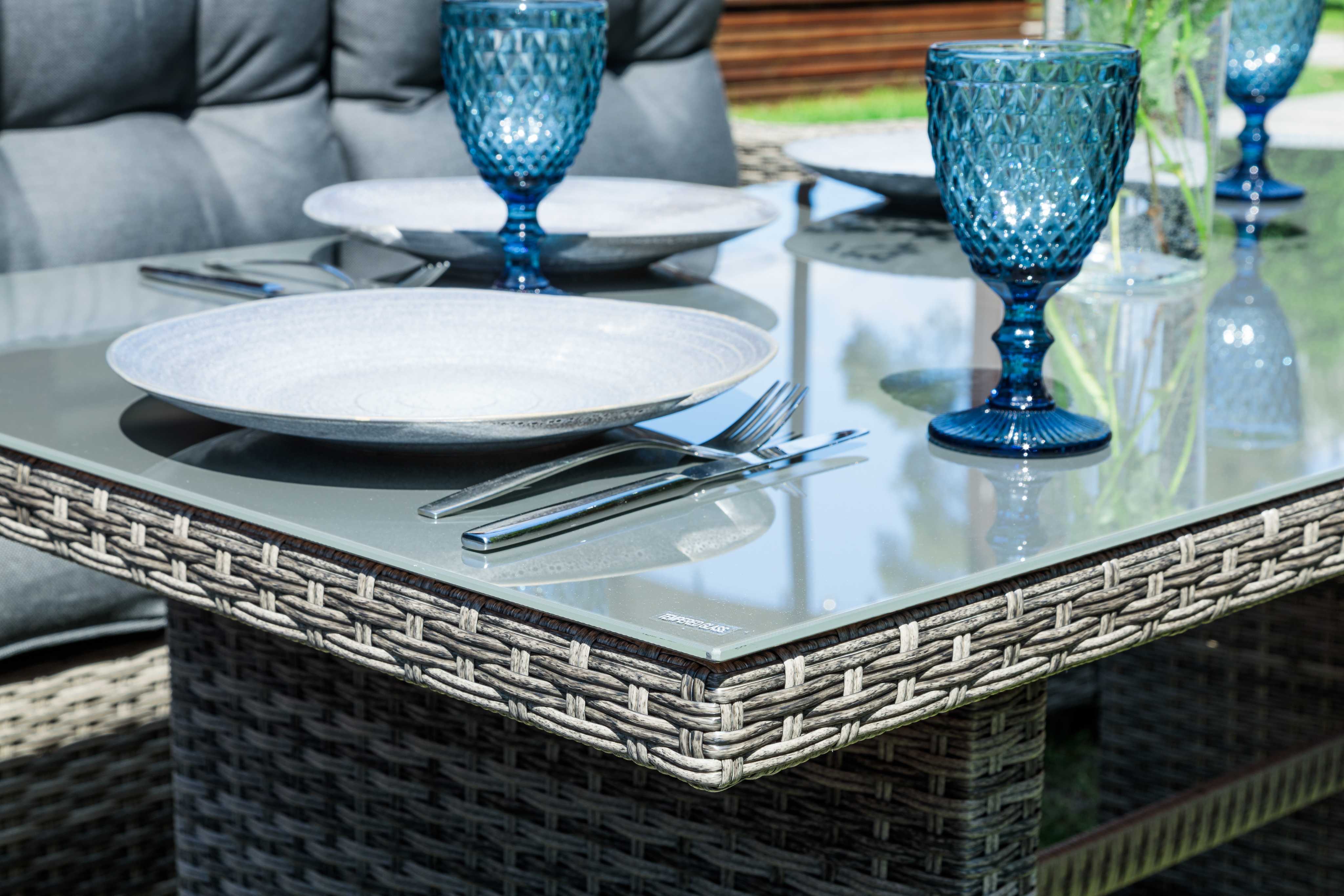 большой обеденный стол со столешницей из закаленного стекла.
