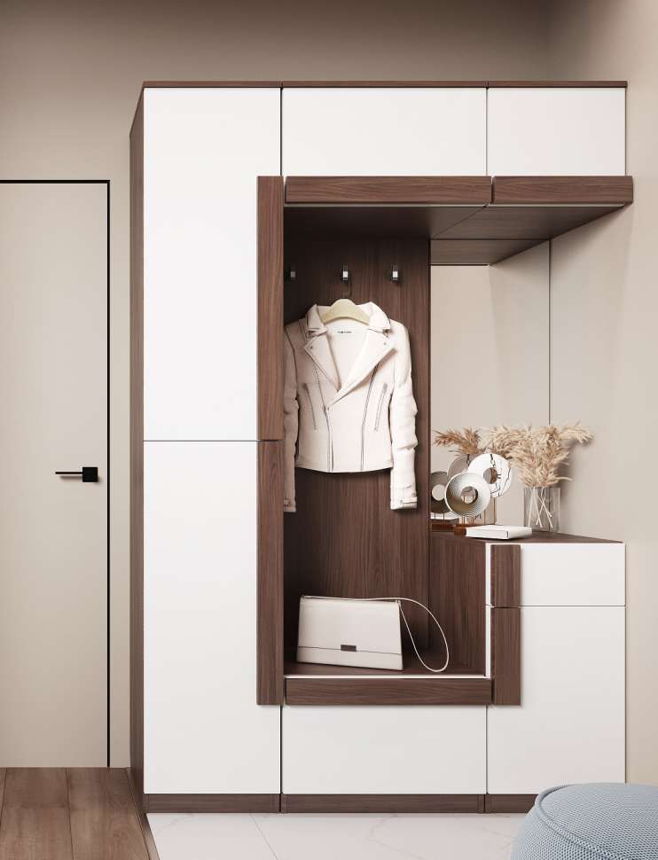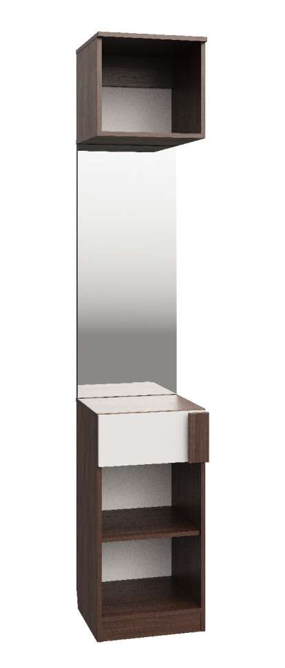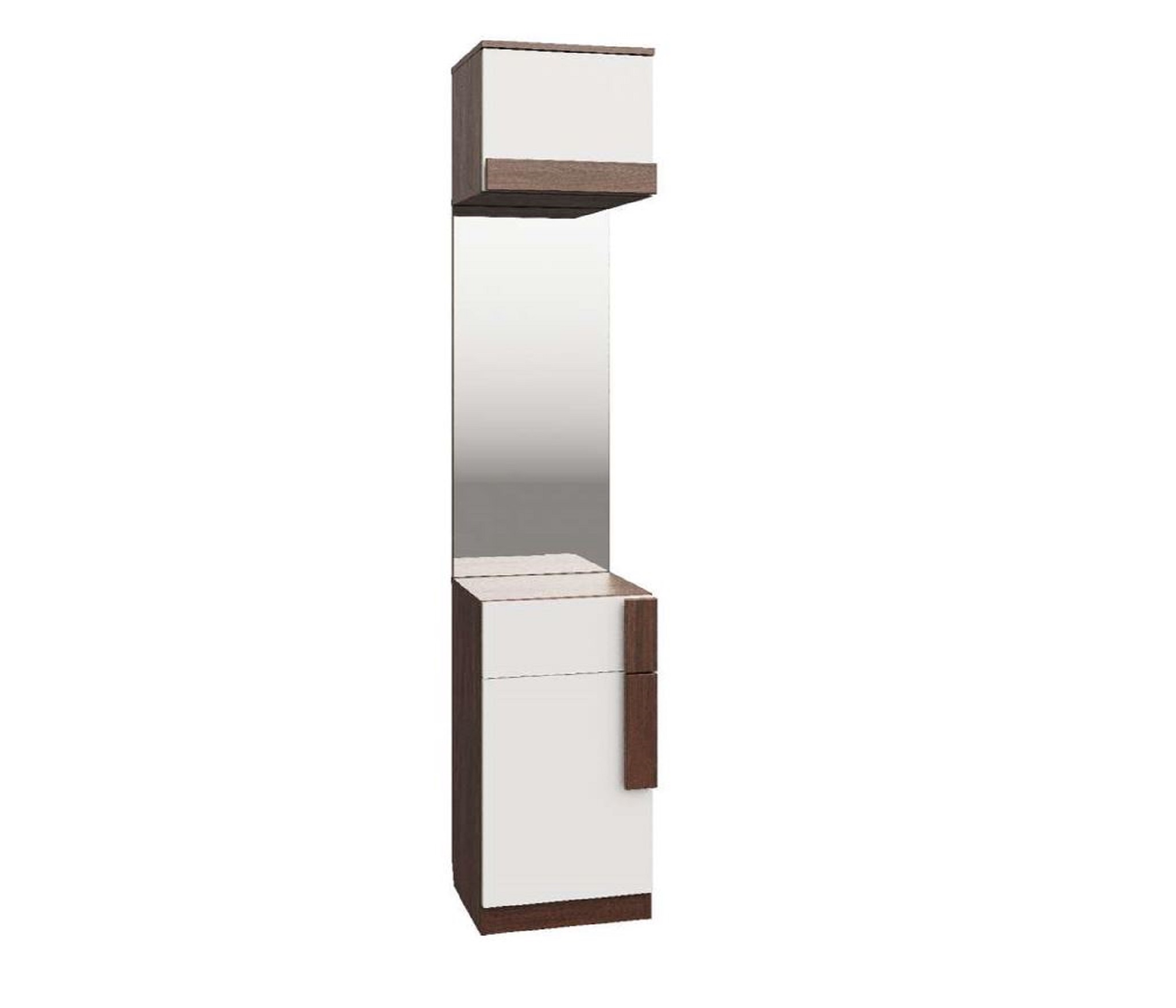 Контрастность сочетания темного декора корпуса Амброзия с безмятежно-белыми глянцевыми фасадами МДФ визуально освежают интерьер и дарят естественную простоту. Оригинальное решение прихожей - ручки геометрической формы, выглядят эффектно и дарят дополнительное удобство при использовании. Идеальное решение для небольших прихожих и для квартир-студий.