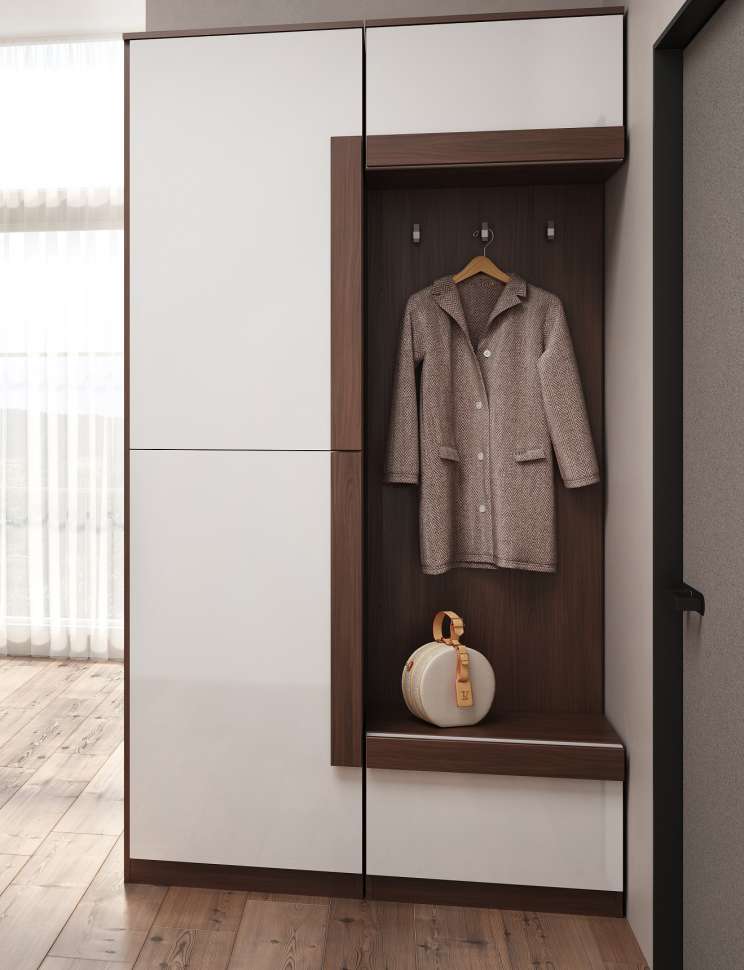 Контрастность сочетания темного декора корпуса Амброзия с безмятежно-белыми глянцевыми фасадами МДФ визуально освежают интерьер и дарят естественную простоту. Оригинальное решение прихожей - ручки геометрической формы, выглядят эффектно и дарят дополнительное удобство при использовании. Коллекция представлена 4-мя модулями, размеры и наполнение которых позволят Вам организовать хранение и сэкономить пространство.