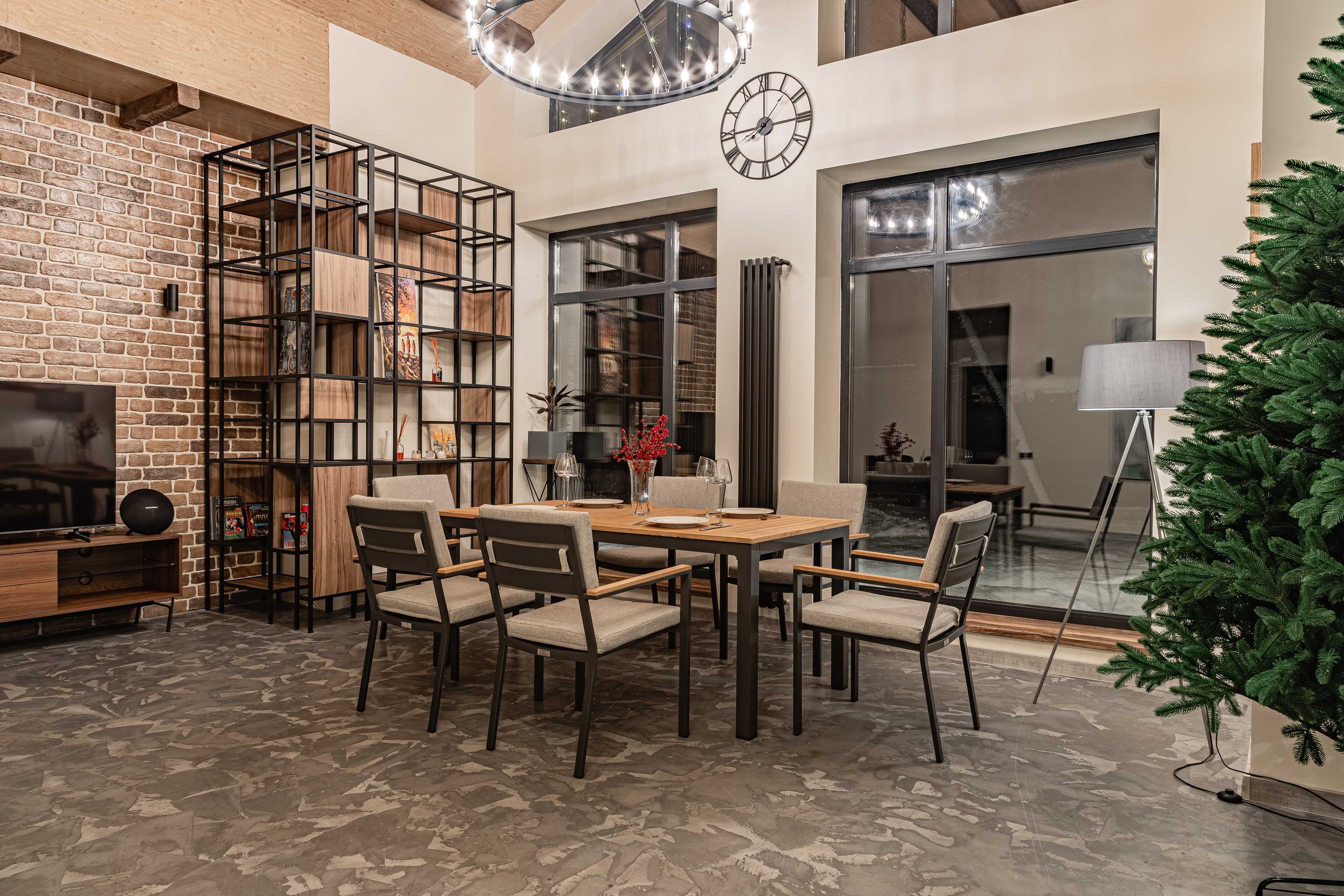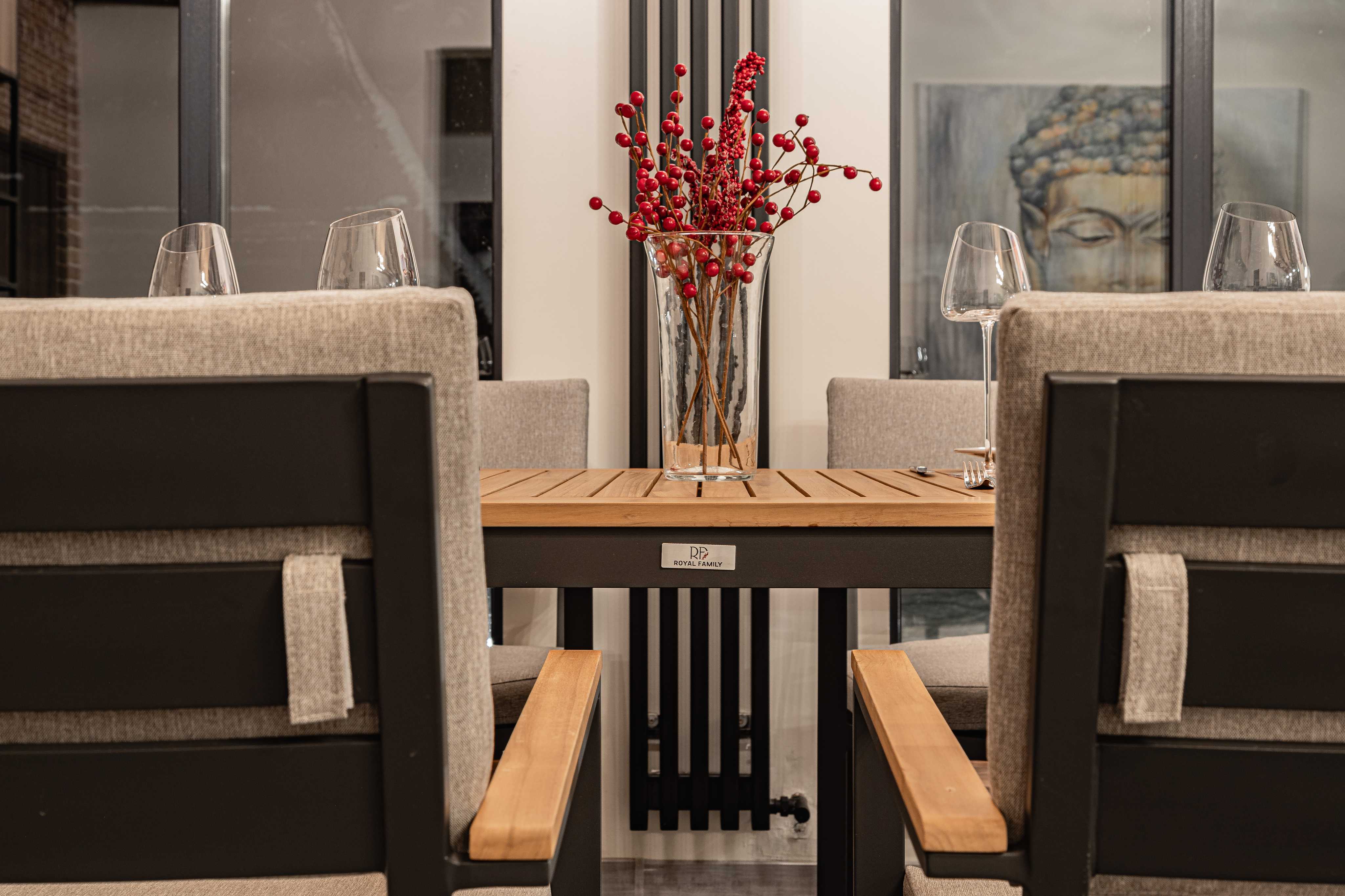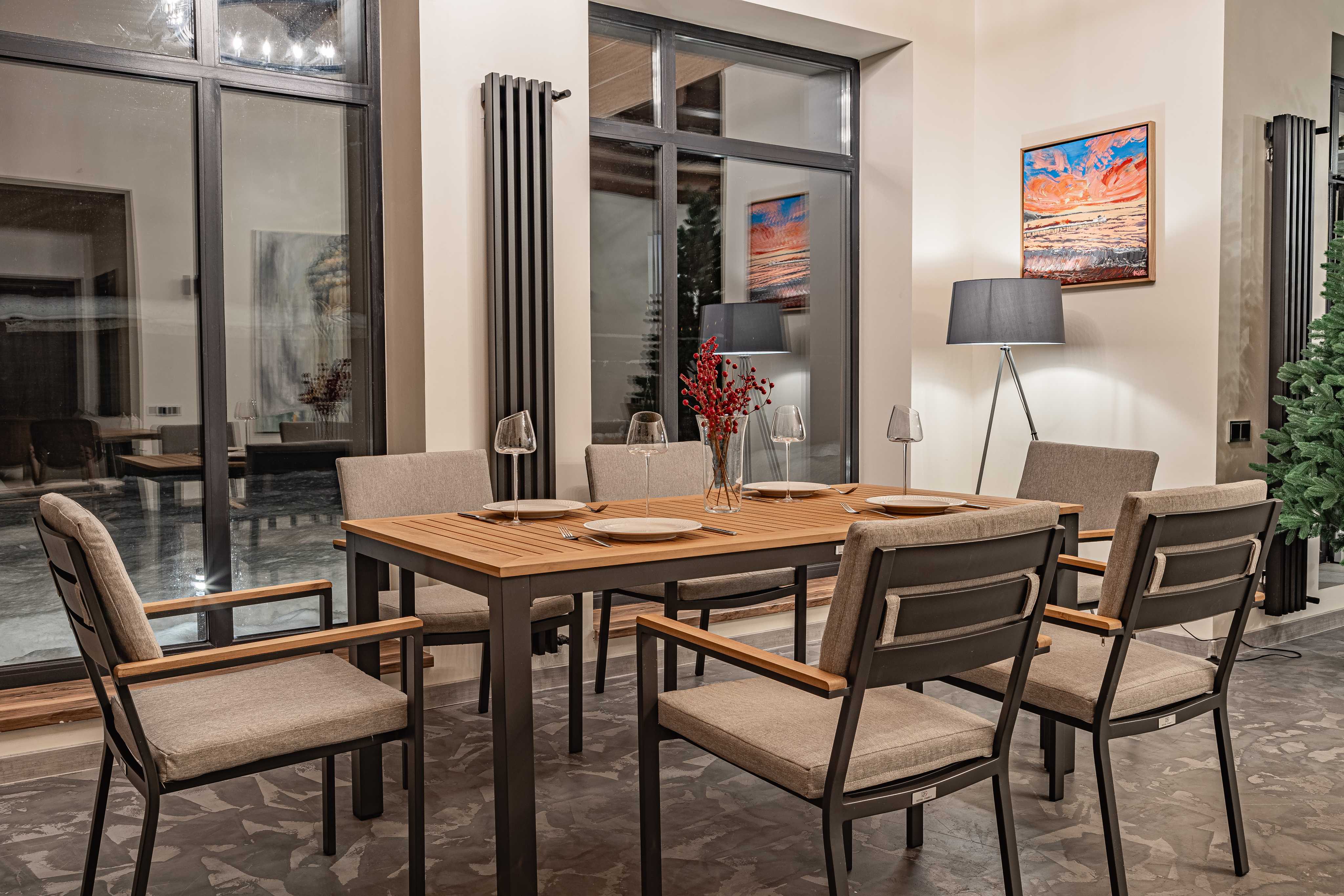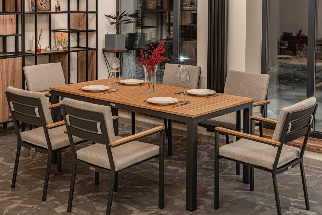 Столешница и подлокотники: Столешница выполнена из тика, что придает обеденному столу натуральный и изысканный вид. Тик также известен своей высокой стойкостью к влаге и ультрафиолетовому излучению, делая его идеальным для использования на открытом воздухе. Подлокотники кресел также выполнены из тика.