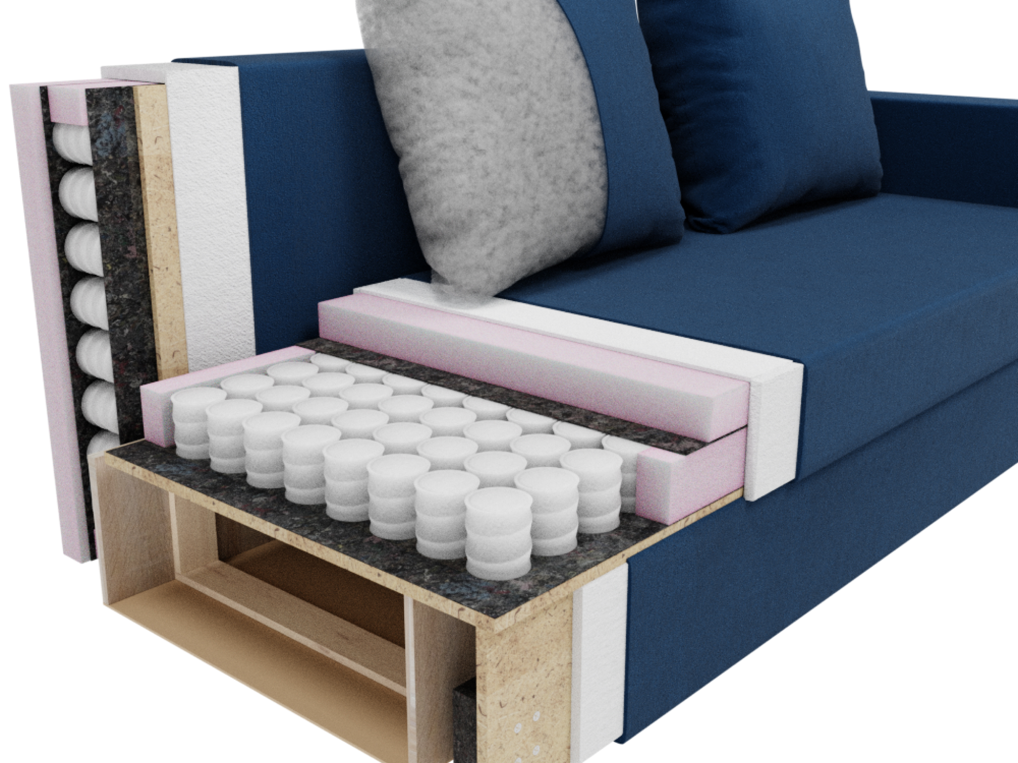 Наполнитель - пенополиуретан, который обеспечивает мягкость и комфорт при сидении. Каркас выполнен из ДВП, ЛДСП и массива дерева, что гарантирует прочность и долговечность изделия.