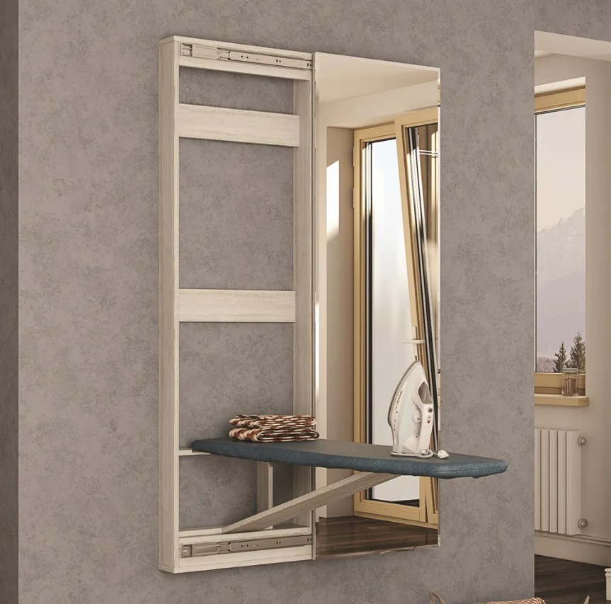 В каждой квартире есть гладильная доска, но не в каждой квартире есть место для ее хранения. Устали постоянно доставать, разбирать, собирать, убирать обратно гладильную доску? Не хватает место для ее хранения? Не можете вписать ее в интерьер? Компания мебельная индустрия предлагает Вам решение. Настенная гладильная доска за зеркалом – это практичное решение, которое понравится любой хозяйке. В закрытом состоянии она выглядит как обычное зеркало в полный рост, а в открытом это полноценная гладильная доска.