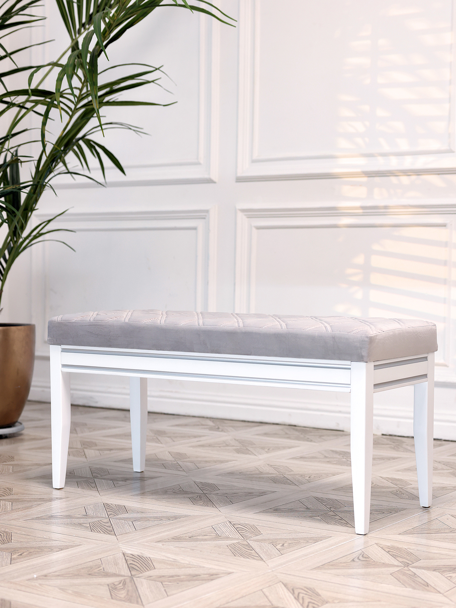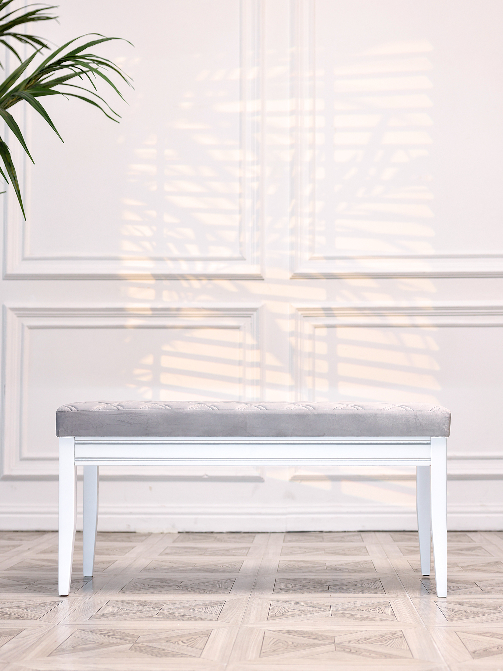 Роскошная банкетка в классическом стиле идеальное дополнение в любой интерьер. Уникальный дизайн, созданный профессионалами, сочетает в себе современные минималистичные мотивы, а также незыблемую классику. Материал банкетки - бук, долговечный, прочный, а также натуральный и невероятно приятный на ощупь. Благодаря уникальным итальянским и немецким швейным машинам мы создали уникальный шов, который делают при создании обивки немецких и итальянских автомобилей. Наша банкетка - универсальный предмет мебели для гостиной и спальни может использоваться разными способами. Прикроватная банкетка в изножье кровати, для складывания покрывала перед сном или одежды. Идеально подойдет для туалетного столика. Пуфик в прихожей, на котором можно присесть и комфортно обуть обувь. Посадочные места на маленькой кухне: вместо кухонного дивана поставьте пару банкеток - диванов. Вы можете задвинуть банкетку под стол и она не будет мешать. Банкетку - диван подойдет для посетителей торговых центров и магазинов, для размещения в примерочной или в торговом зале. На банкетке можно удобно отдохнуть или положить одежду, сумку. Банкетки также используют в офисах, салонах красоты, конференц залах, гостиницах и ресторанах. Ткань легко отмывается, а ножки легко вкручиваются. Сборка занимает не более 5 минут. Размеры банкетки: 1015 мм* 480мм*410мм.