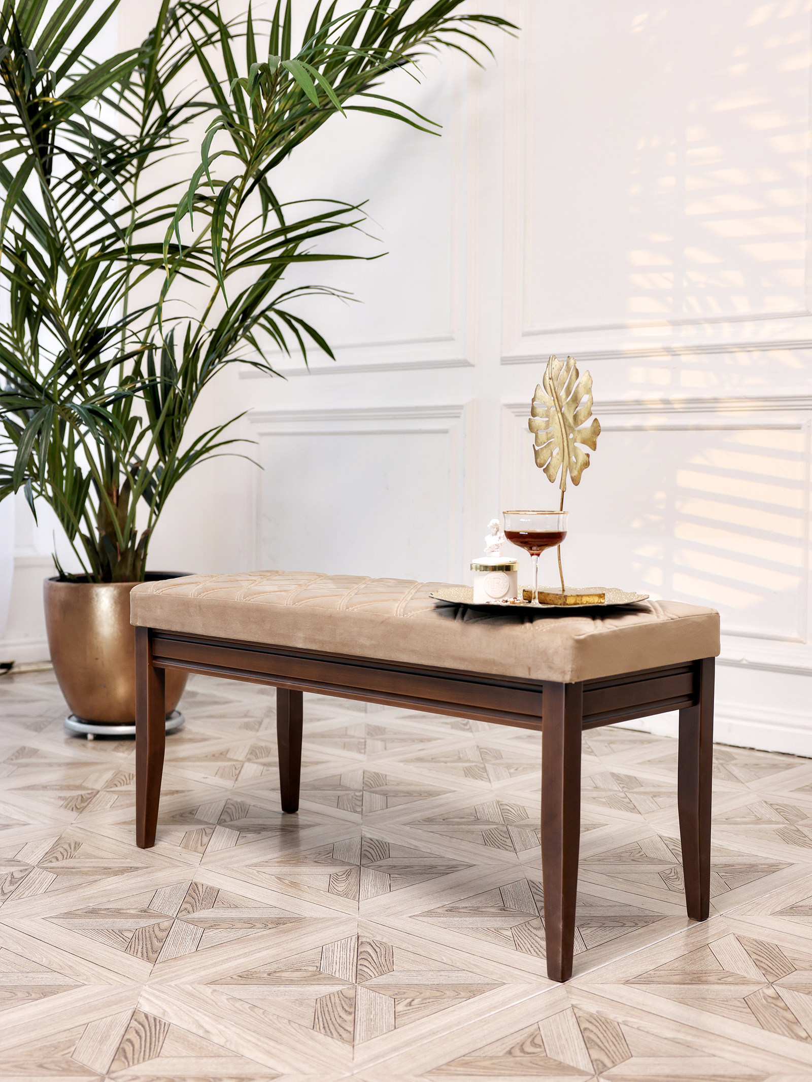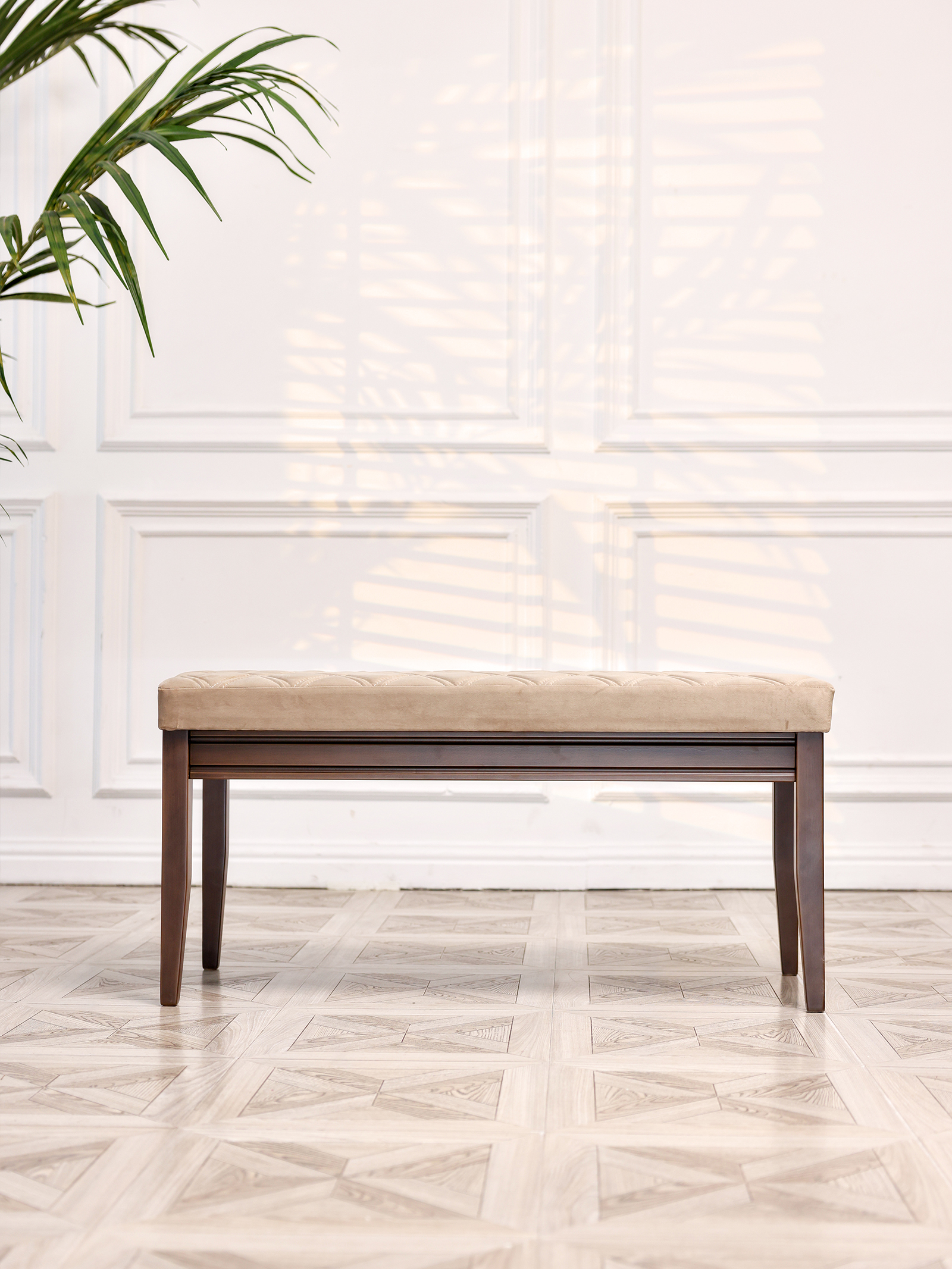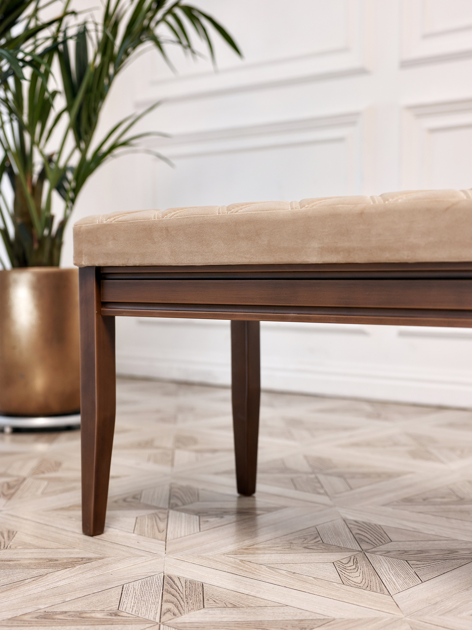 Роскошная банкетка в классическом стиле идеальное дополнение в любой интерьер. Уникальный дизайн, созданный профессионалами, сочетает в себе современные минималистичные мотивы, а также незыблемую классику. Материал банкетки - бук, долговечный, прочный, а также натуральный и невероятно приятный на ощупь. Благодаря уникальным итальянским и немецким швейным машинам мы создали уникальный шов, который делают при создании обивки немецких и итальянских автомобилей. Наша банкетка - универсальный предмет мебели для гостиной и спальни может использоваться разными способами. Прикроватная банкетка в изножье кровати, для складывания покрывала перед сном или одежды. Идеально подойдет для туалетного столика. Пуфик в прихожей, на котором можно присесть и комфортно обуть обувь. Посадочные места на маленькой кухне: вместо кухонного дивана поставьте пару банкеток - диванов. Вы можете задвинуть банкетку под стол и она не будет мешать. Банкетку - диван подойдет для посетителей торговых центров и магазинов, для размещения в примерочной или в торговом зале. На банкетке можно удобно отдохнуть или положить одежду, сумку. Банкетки также используют в офисах, салонах красоты, конференц залах, гостиницах и ресторанах. Ткань легко отмывается, а ножки легко вкручиваются. Сборка занимает не более 5 минут. Размеры банкетки: 1015 мм* 480мм*410мм.