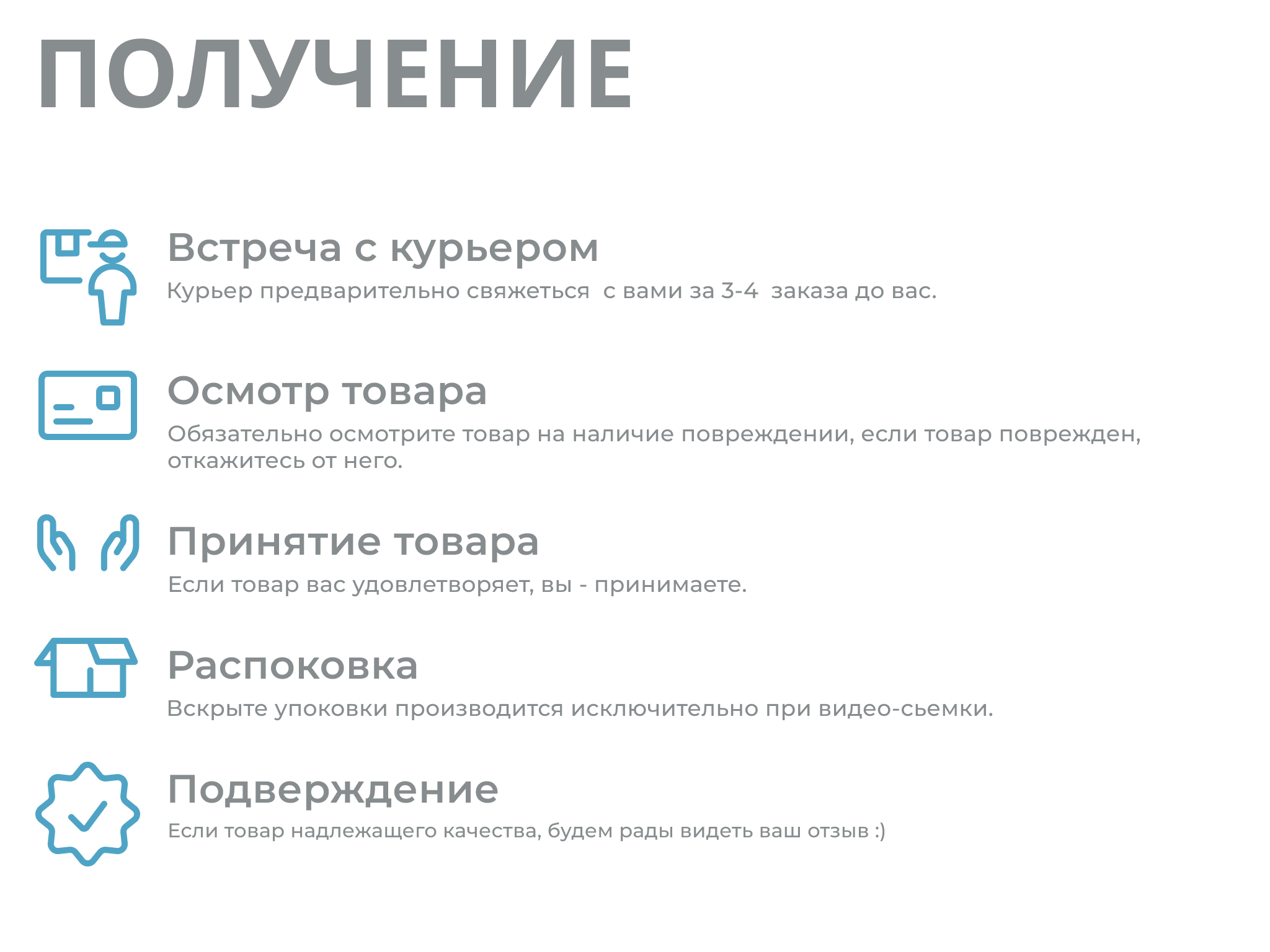 Распаковка товара обязательно производить с видеофиксацией. Если с товаром что-то случилось, потребуется видео и фото данной проблемы для принятия решения. Рассмотрение рекламации до 3-х рабочих суток с момента подачи заявления.