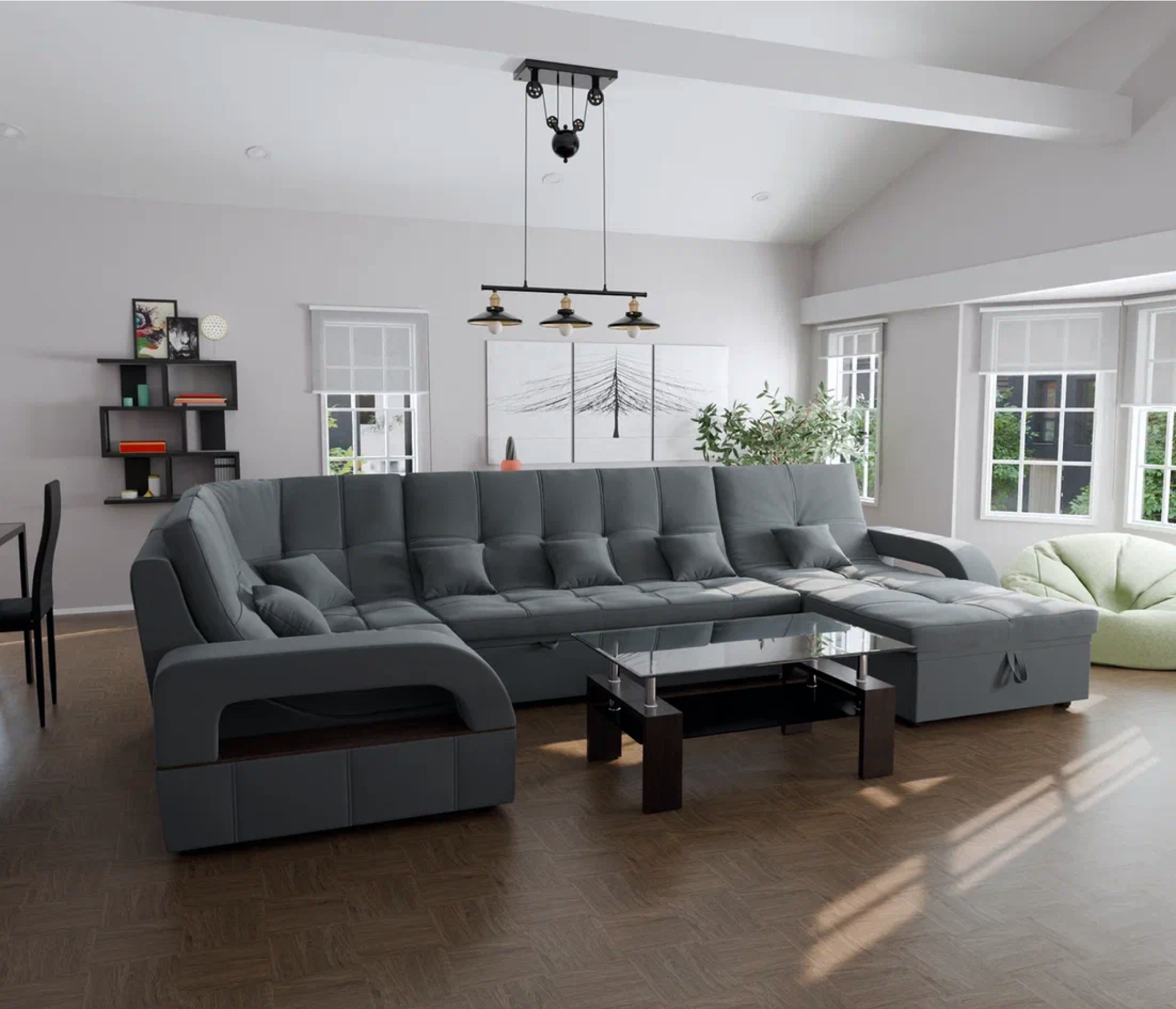 Он имеет высоту 97 см, ширину 350 см и глубину 187 см. Обит велюром - Veluta lux. Диван обладает универсальным расположением угла, что позволяет его использовать в любом помещении.
