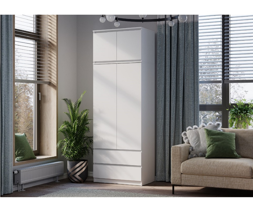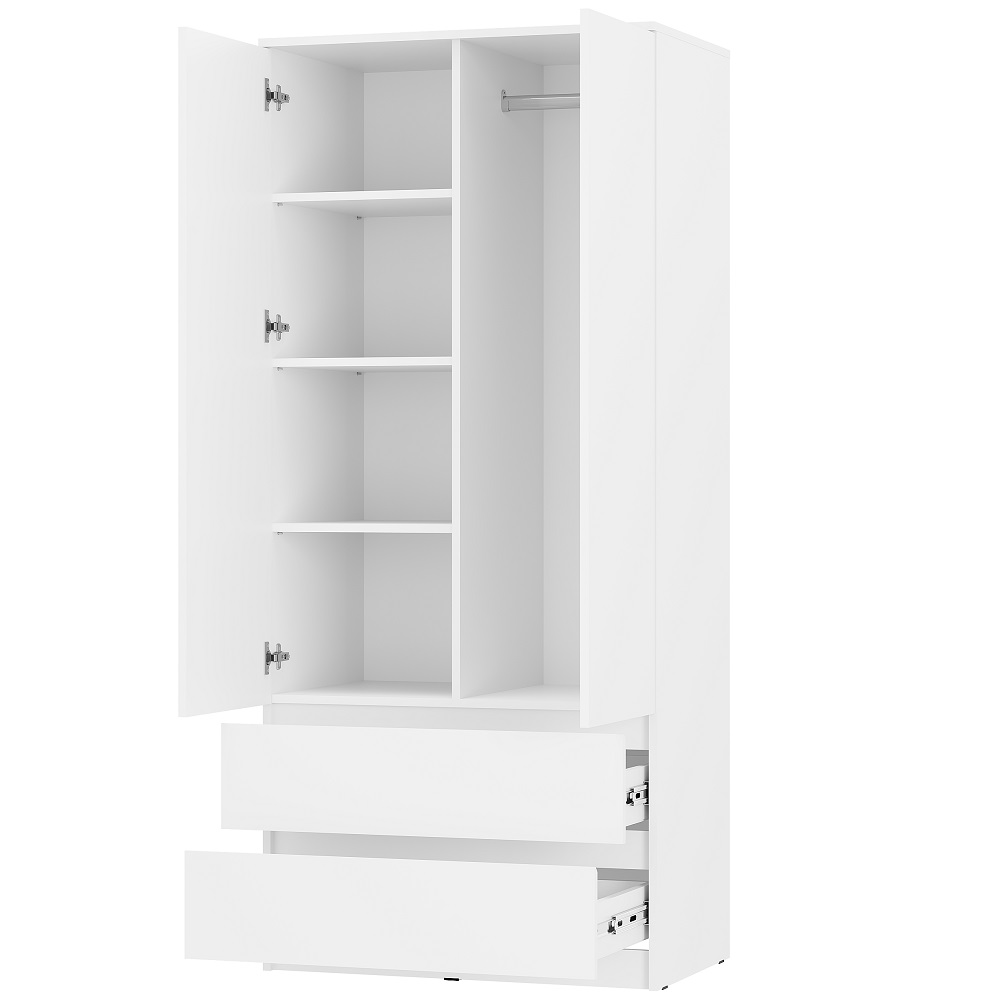 Лаконичный и многофункциональный двухстворчатый шкаф Симпл ШК-03 с антресолью дополнит современный дизайн Вашей квартиры. Большое количество полок для вещей в сложенном виде, штанга для деликатной одежды на плечиках и ящики для белья и аксессуаров помогут организовать хранение одежды в одном месте во входной зоне или спальне.