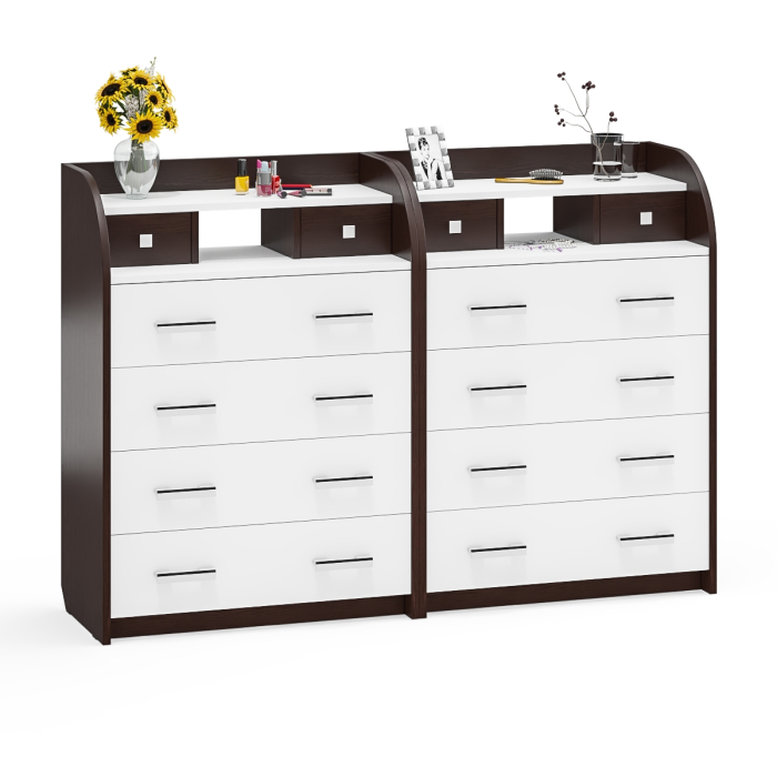 Два комода объединены в единый блок. Каждый комод имеет четыре больших широких ящика и два небольших верхних ящичка, между которыми расположилась открытая ниша. В ящиках достаточно места для хранения одежды, белья, вещей, игрушек, посуды, косметики или документов. Широкие ящики закреплены на роликовых направляющих, что обеспечивает плавное и лёгкое их выдвижение. Пара верхних выдвижных ящичков выполнены в виде удобных незакреплённых шкатулочек, расположенных в нишах.