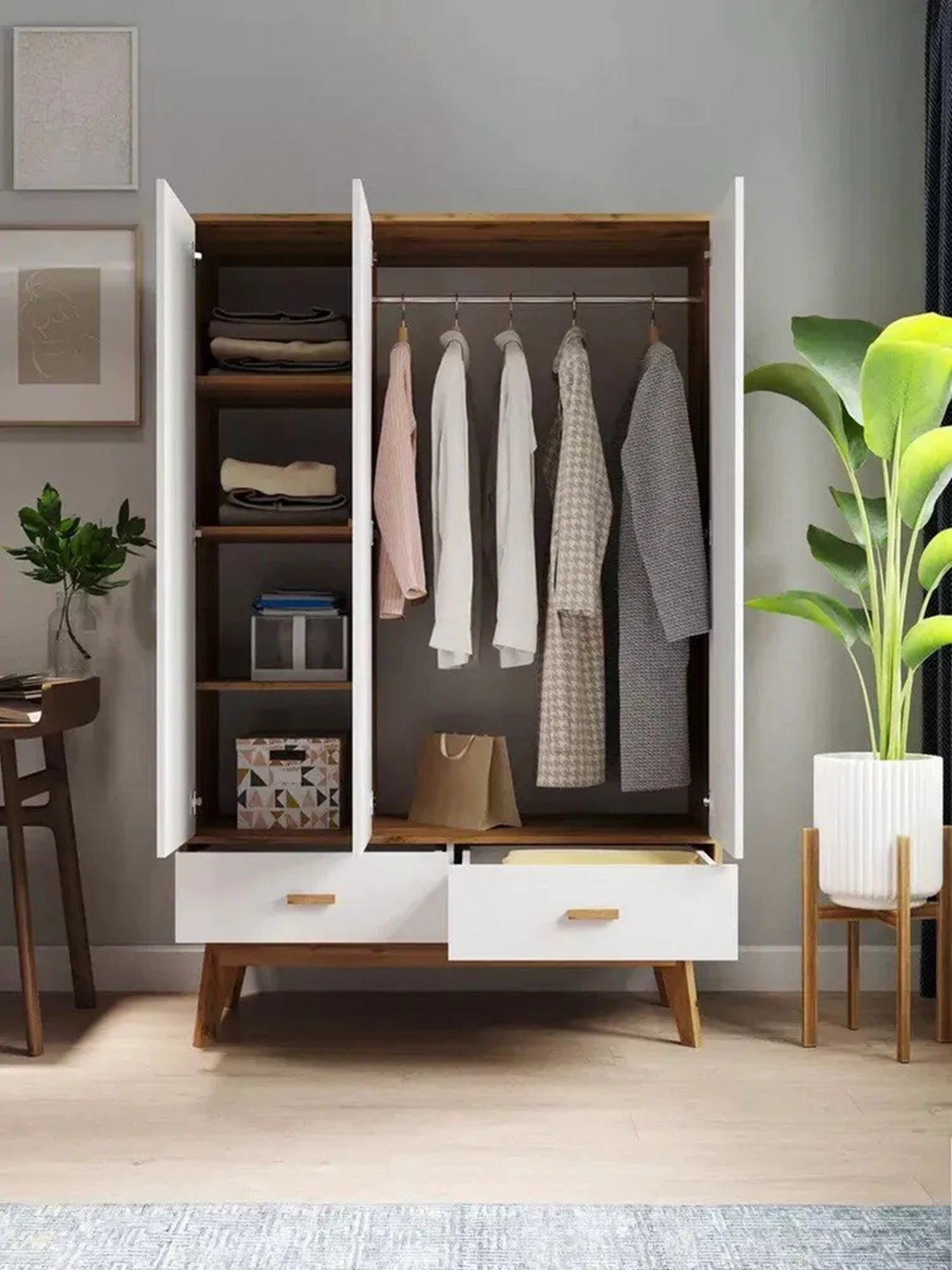 3-х дверный распашной шкаф Радиорама 2123 с двумя ящиками идеальное решение для вашего интерьера. Этот шкаф распашной обладает всеми необходимыми функциями и стильным дизайном. Он позволяет организовать пространство и хранить вещи в порядке. Создан из высококачественных материалов, этот шкаф 3-х дверный обеспечивает надежность и долговечность. Он также имеет высокие ножках, что придает ему легкость и изящность. В данной модели присутствуют 2 выдвижных ящика, которые позволяют удобно разместить аксессуары или белье. Шкаф для одежды с полками и штангой обеспечивает удобство хранения различных типов одежды. Вы сможете организовать пространство так, чтобы все было под рукой. Он станет отличным дополнением к вашему интерьеру и поможет сохранить порядок в вашей комнате.