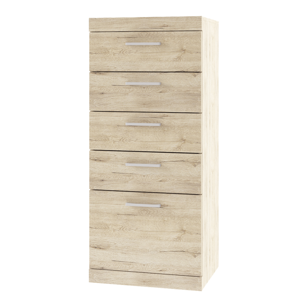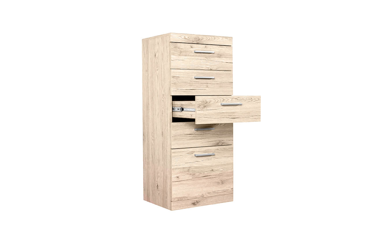 Комод Оскар 5S/50 создаст современный и уютный интерьер спальни, молодёжной комнаты, прихожей, даже с небольшой площадью, так как ширина изделия – 501 мм. Комод 5S/50 прямой. Конструкция элемента представляет собой пять выдвижных ящиков, расположенных друг над другом.Основные характеристики:цвет – Дуб Санремо;