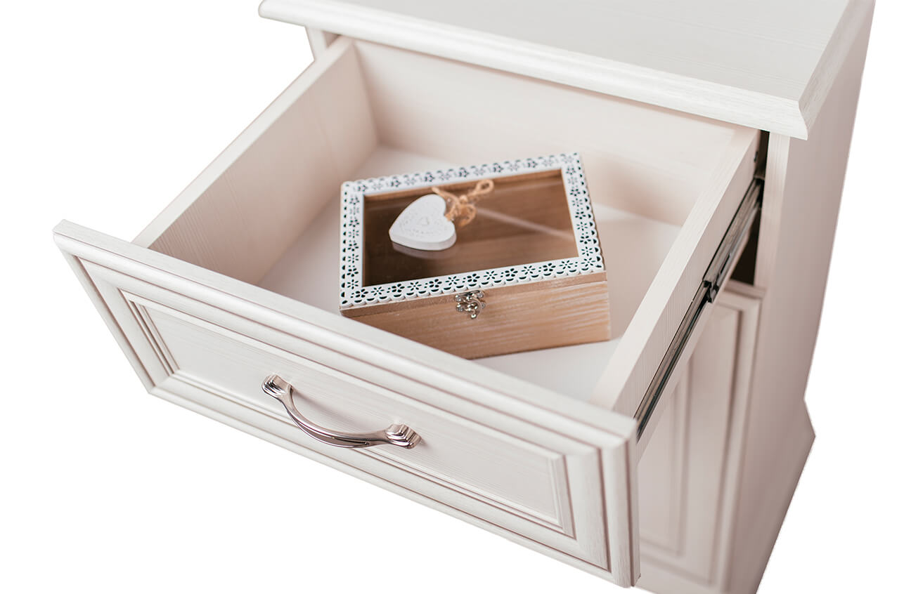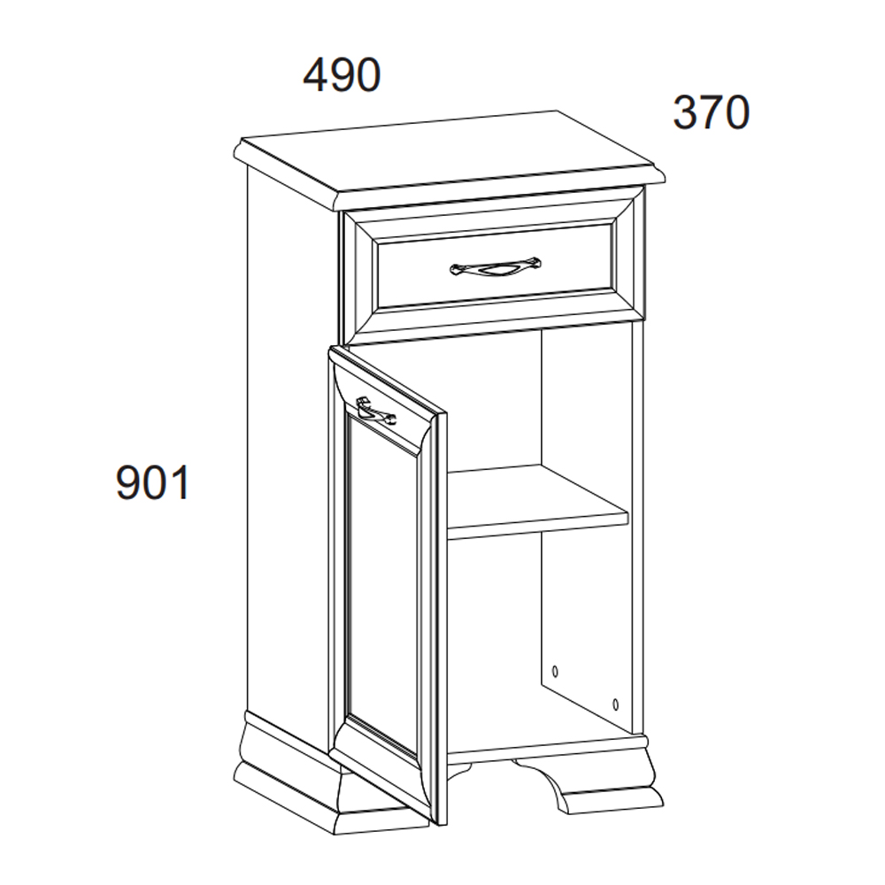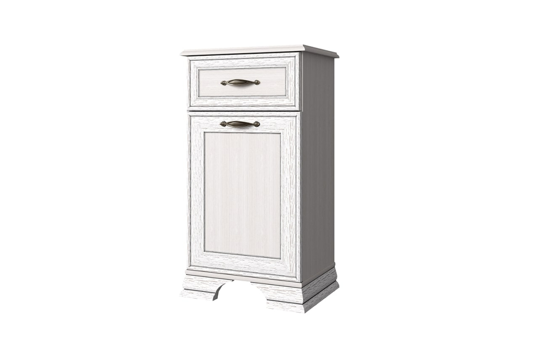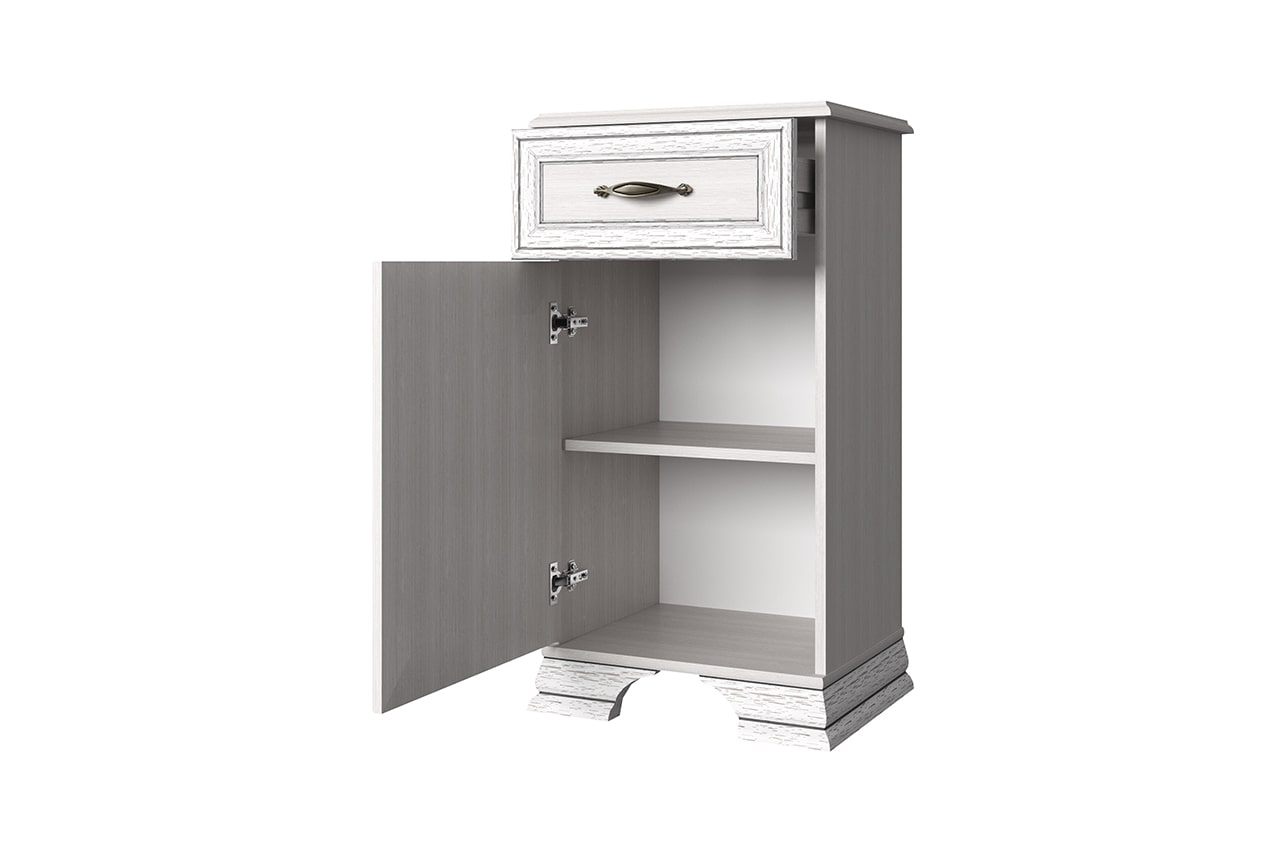 умба Тиффани 1D1S. Элемент, который украсит интерьер гостиной, столовой, молодёжной и спальни. Тумба 1D1S – прямая. Имеет одно отделение с нишами за двумя глухими дверями (1D) для хранения белья, предметов одежды, посуды; и один выдвижной ящик (1S), где можно хранить украшения, столовые приборы, салфетки и другие предметы. Дверцы распашные, крепятся на петлях к боковинам. Основные характеристики: -рамочно-филенчатые фасады (патинированная планка из МДФ, филенка - ЛДСП); -металлические ручки (сплав цинка и алюминия); -декоративные короны, ножки – МДФ; -полка – ЛДСП; -шариковые направляющие полного выдвижения.