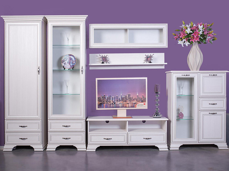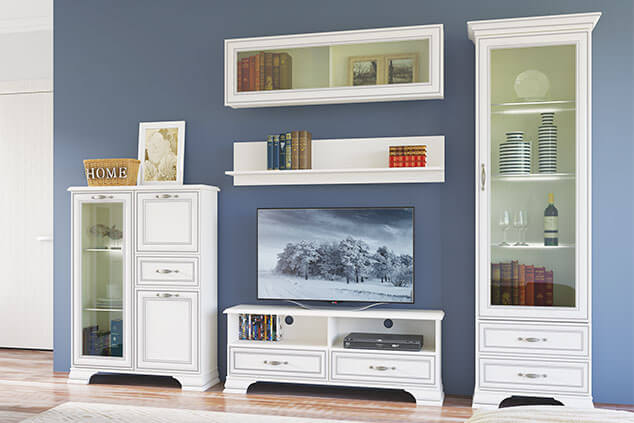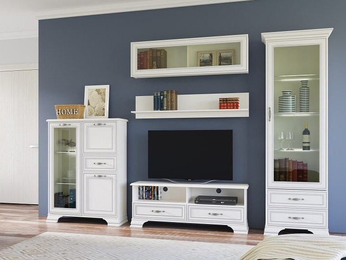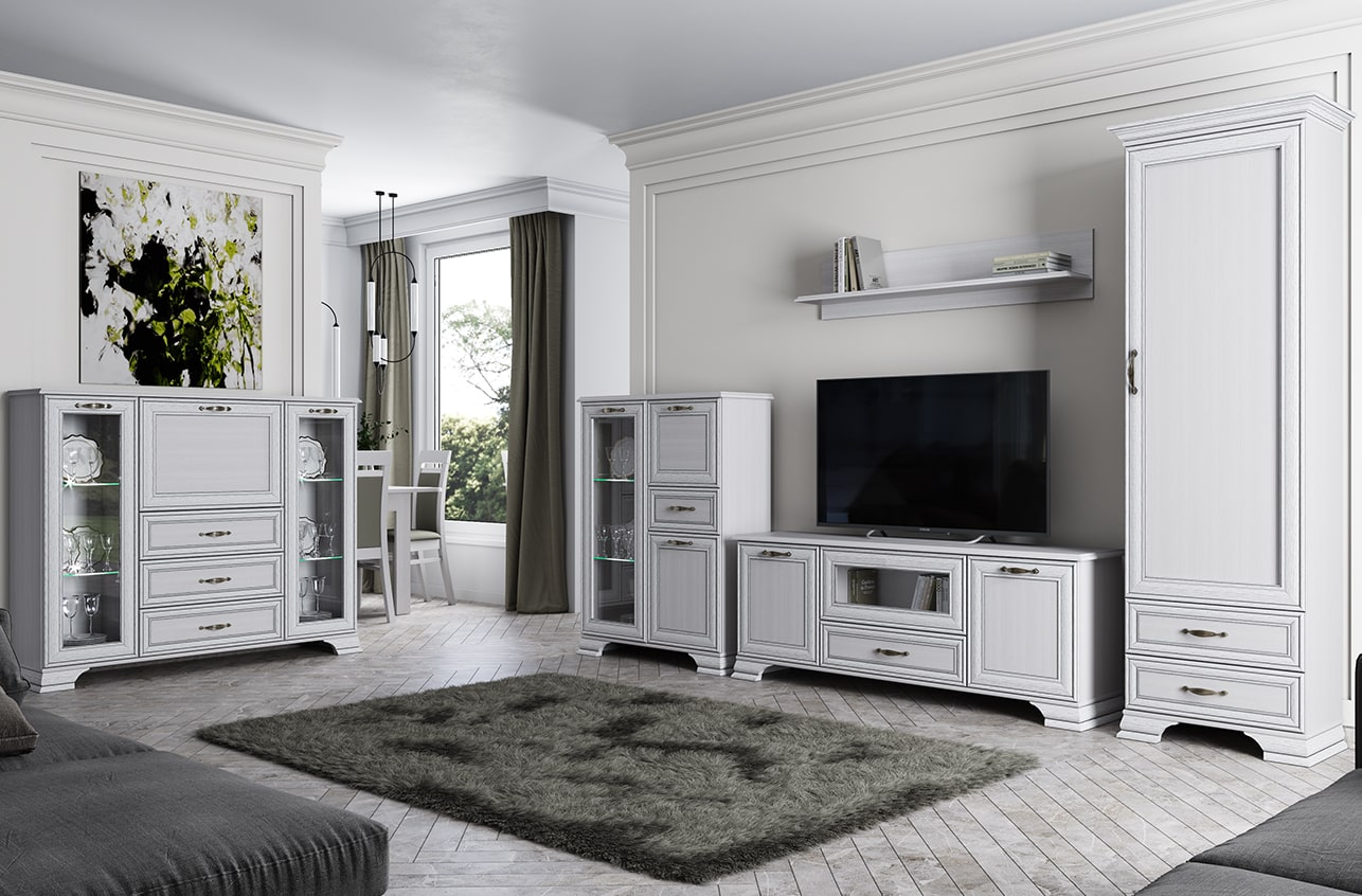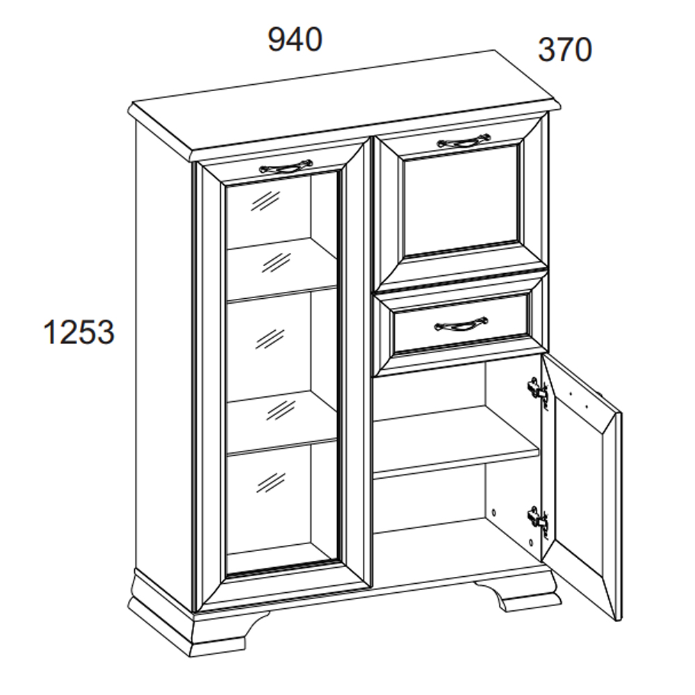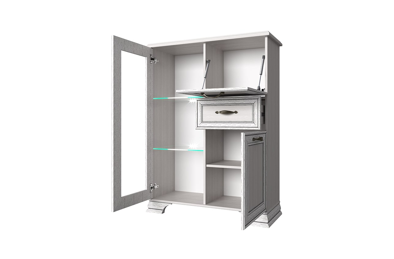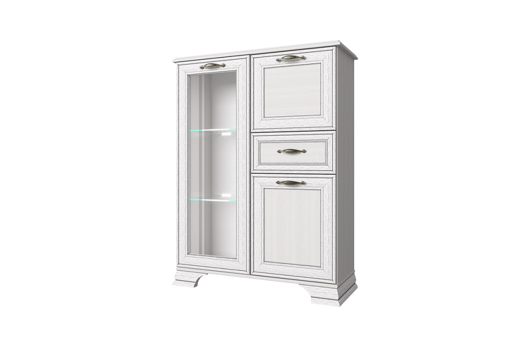 Тумба Тиффани 1V2D1S, такой элемент подходит для оформления интерьера в классическом стиле гостиной, столовой, кабинета. Тумба 1V2D1S – прямая. Конструкция элемента представляет собой две вместительные ниши с откидной дверью и распашной (2D – двери глухие), одно отделение с полками из закалённого стекла за витриной (1V – закалённое стекло) для хранения посуды, предметов декора и других вещей; и один выдвижной ящик (1S) для хранения предметов быта, салфеток. Основные характеристики: -рамочно-филенчатые фасады (патинированная планка из МДФ, филенка - ЛДСП), витрина – закалённое стекло (4 мм); -полки – закалённое стекло (6 мм); -металлические ручки (сплав цинка и алюминия); -декоративные короны, ножки – МДФ; - дополнительная опция – светодиодная подсветка для полок из закалённого стекла (Klips LED). На одну полку идёт одна клипса, на которой находится три светодиода; -шариковые направляющие полного выдвижения;