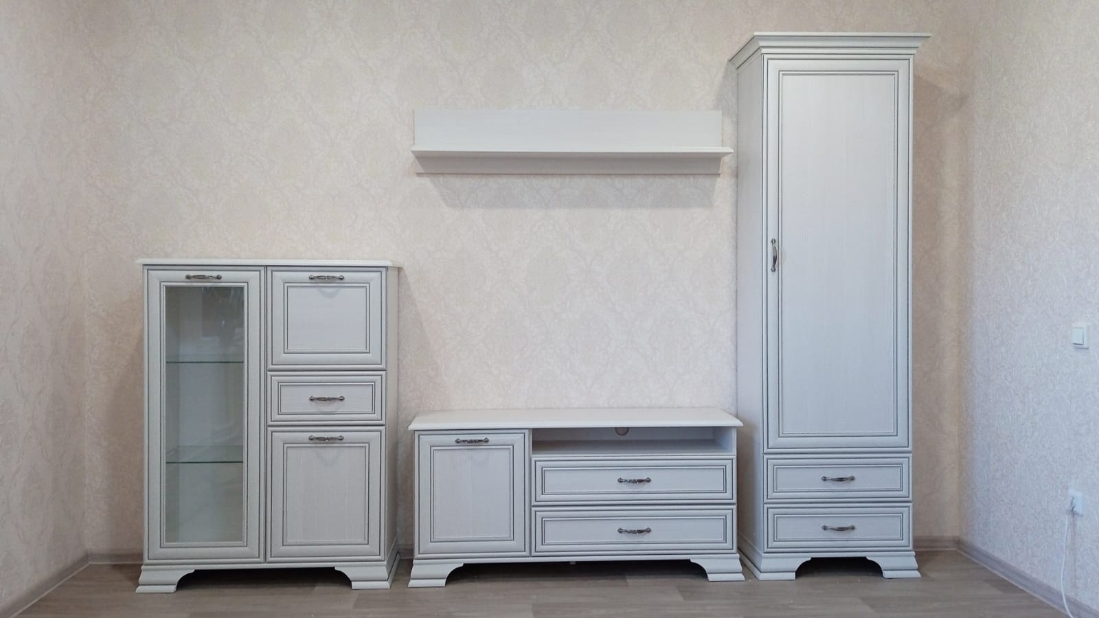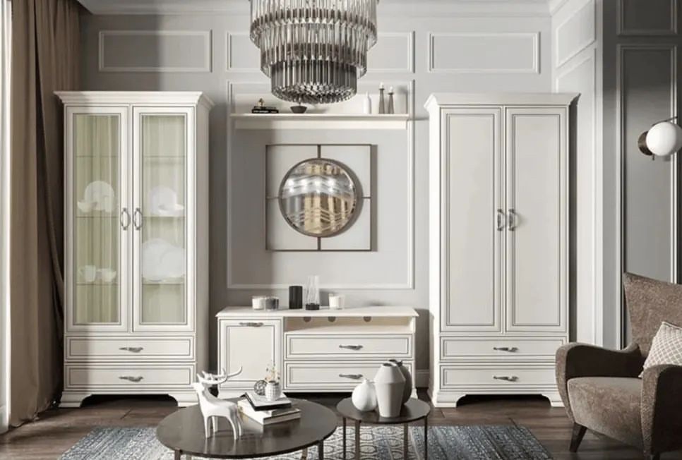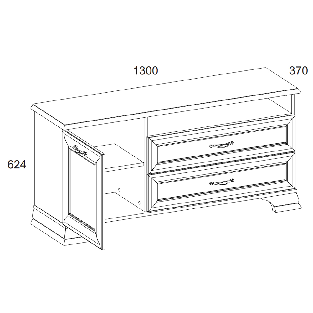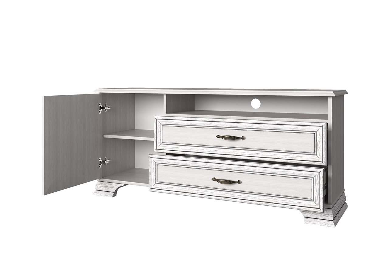 Тумба RTV 1D2SN Тиффани даёт возможность разместить технику выше, чем на тумбе RTV 2S2N. Тумба RTV 1D2SN – прямая. Имеет под верхним щитом открытую нишу (N) для расположения других видов техники небольших размеров, два выдвижных ящика (2S) для хранения мелких предметов (пульты, провода, батарейки, а также газеты, журналы, фотоальбомы и другие вещи), за глухой дверью – отделение с полкой (1D). Дверь распашная, крепится на петлях к боковине. Этот элемент создаст законченную композицию с такими предметами коллекции Тиффани, как Полка навесная 1D, Полка навесная 1V, Полка B. Основные характеристики: -рамочно-филенчатые фасады (патинированная планка из МДФ, филенка - ЛДСП); -металлические ручки (сплав цинка и алюминия); -декоративные короны, ножки – МДФ; -шариковые направляющие полного выдвижения;