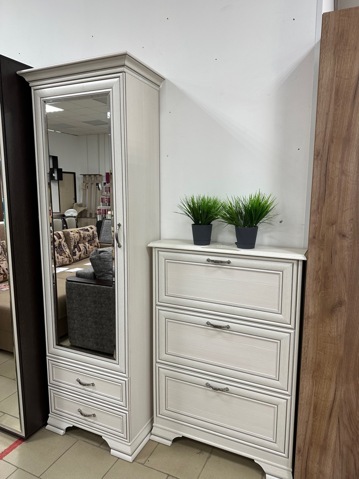 Шкаф Тиффани 1Z2S. Такой элемент может входить как в базовый набор мебели прихожей, молодёжной, так и быть отдельным предметом в интерьере (в помещениях малой площади). Шкаф 1Z2S - прямой. Конструкция элемента представляет собой одно отделение с полками из ЛДСП за глухой дверью, на двери крепится зеркало (1Z), два выдвижных ящика (2S). Дверца крепится на петли к боковому корпусу. Основные характеристики: -рамочно-филенчатые фасады (патинированная планка из МДФ, филенка - ЛДСП); -металлические ручки (сплав цинка и алюминия); -декоративные короны, ножки – МДФ; -полки - ЛДСП; -элемент с зеркалом (1Z); -шариковые направляющие полного выдвижения.