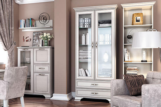 Шкаф открытый Тиффани 2S поможет оформить интерьер гостиной и столовой в классическом стиле. Шкаф открытый 2S – прямой. Конструкция элемента представляет собой одно открытое отделение с полками из ЛДСП для хранения предметов декора, книг, посуды, памятных вещей и т.д., дополнительную комодную секцию – два выдвижных ящика (2S) для организации хранения мелких предметов быта, полотенец, салфеток и других вещей, которые должны быть скрыты. Основные характеристики: -рамочно-филенчатые фасады (патинированная планка из МДФ, филенка - ЛДСП); -металлические ручки (сплав цинка и алюминия); -декоративные короны, ножки – МДФ; -полки - ЛДСП; -шариковые направляющие полного выдвижения.