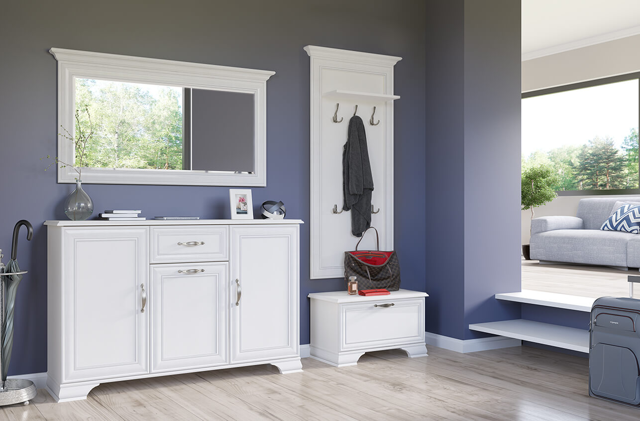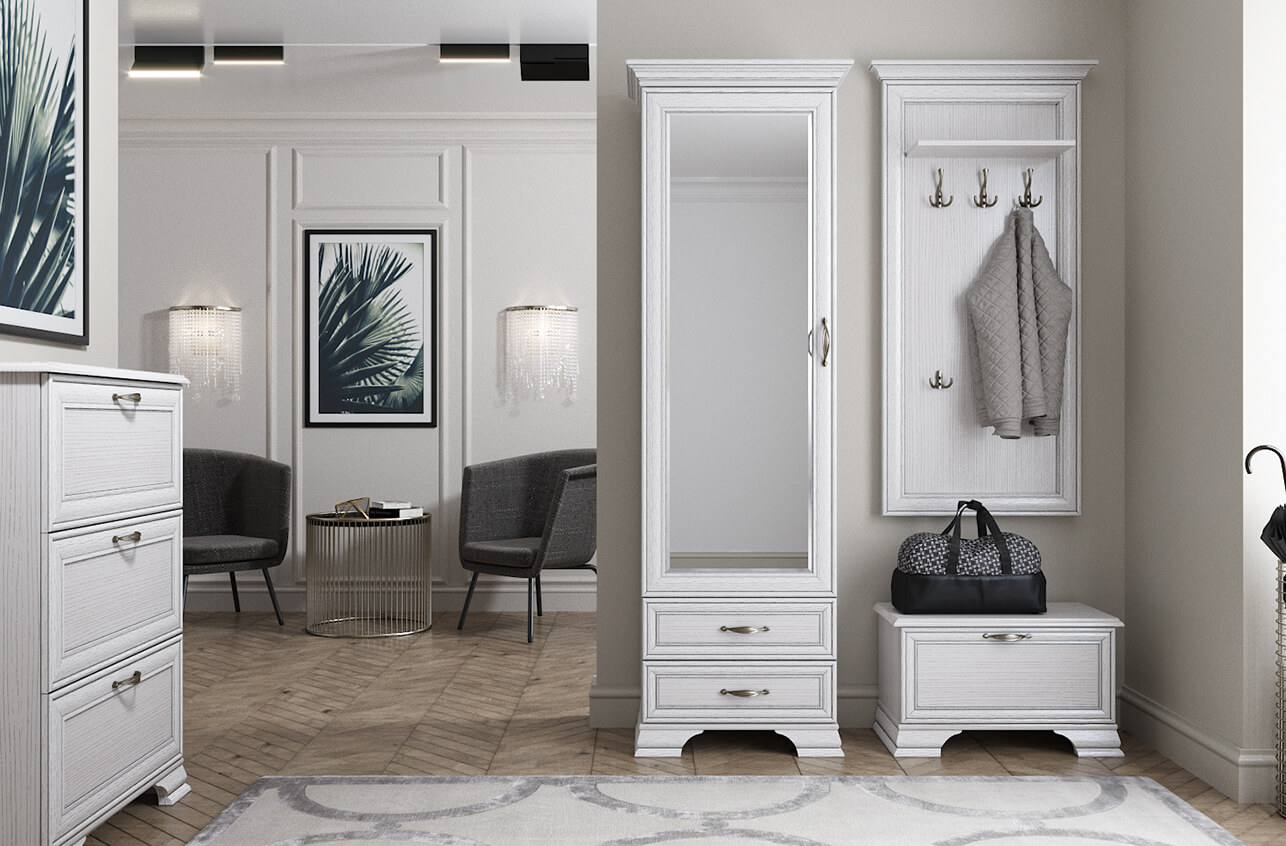 Гармоничный комплект – идеально сочетается с тумбой для обуви 1D из коллекции «Тиффани» (одинаковая ширина – 700 мм).