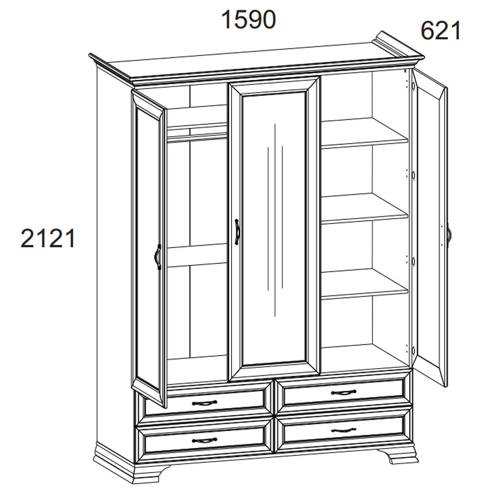 Шкаф Тиффани 3D4S для спальни. Имеет три двери (3D), дополнительную комодную секцию – четыре выдвижных ящика (4S). Шкаф 3D4S прямой. Конструкция элемента представляет собой одно гардеробное отделение для одежды с одной штангой и вместительной нишей для головных уборов и других вещей за глухими дверями (на средней двери снаружи закреплено зеркало), одно отделение с полками для белья, одежды и других вещей за глухой дверью. Дверцы распашные, крепятся на петли к боковому корпусу и внутренней перегородке. Основные характеристики: -рамочно-филенчатые фасады (патинированная планка из МДФ, филенка - ЛДСП); -металлические ручки (сплав цинка и алюминия); -декоративные короны, ножки – МДФ; -элемент с зеркалом; -шариковые направляющие полного выдвижения.