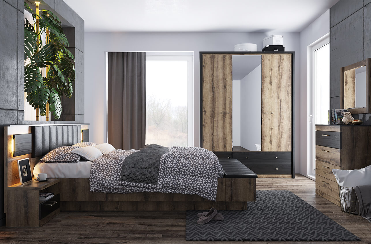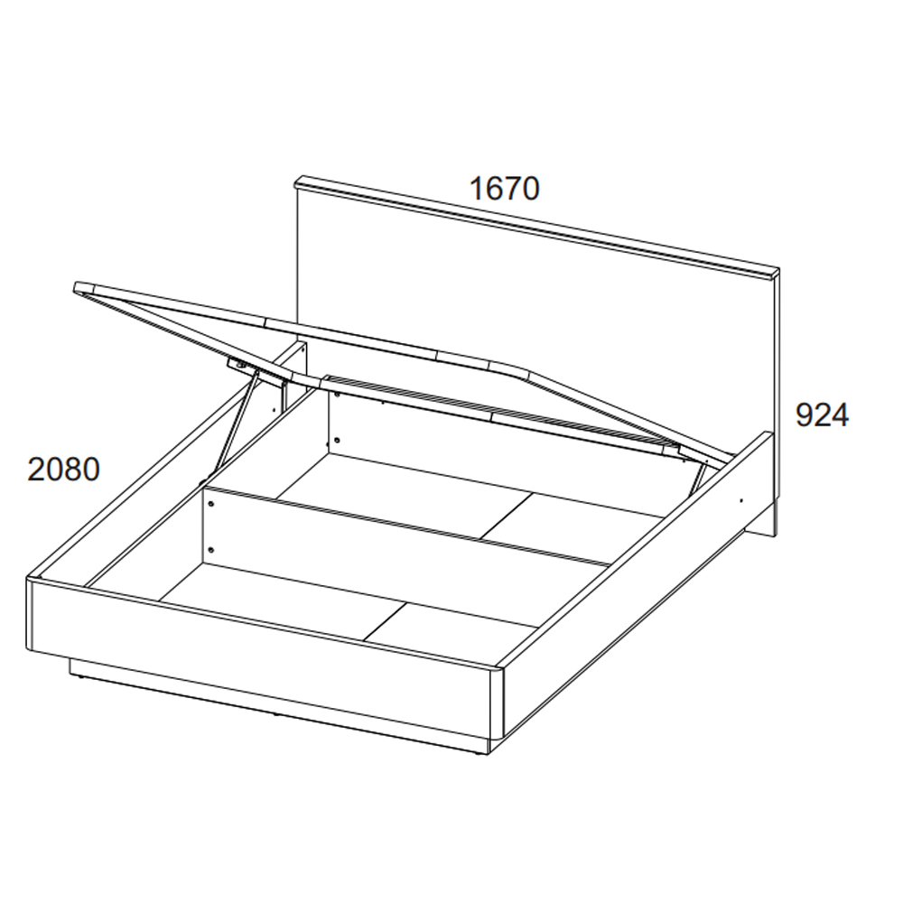 Кровать Джаггер 160 с подъёмным механизмом - двухспальная, размер спального места – 1600*2000 мм (ширина - 1670 мм, глубина - 2080 мм). Конструкция кровати представлена сплошным изголовьем прямоугольной формы (с планкой в цвете чёрный) и изножьем прямоугольной формы, царгами и металлическим основанием с подъёмным механизмом, большими удобными ящиками для хранения вещей, белья и предметов быта. Деревянные ламели служат дополнительной амортизирующей основой. Основные характеристики: -цвет – дуб Монастырский (16 мм, 32 мм), чёрный – планка на изголовье (18 мм); -высота кровати по изголовью – 924 мм; -деревянные ламели с пластиковыми креплениями – берёза; -металлическое основание кровати – цельный металлический профиль с защитным покрытием (без ножек); -подъёмный механизм - газовый амортизатор.