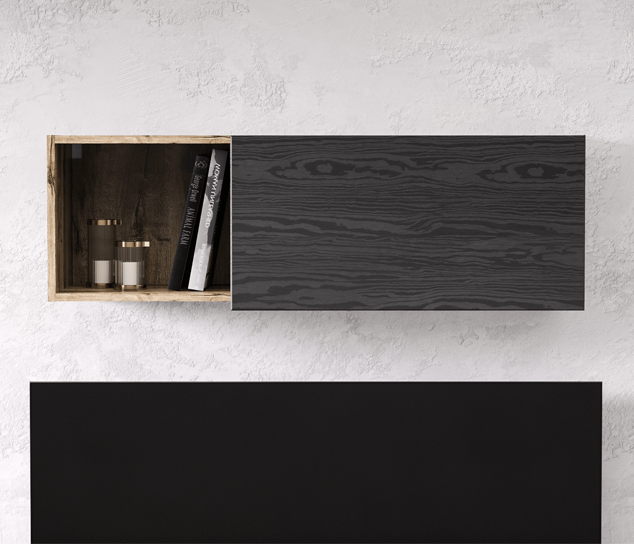 Полка навесная Джаггер 1DN – яркое и динамичное дополнение интерьера гостиной. Полка навесная 1DN прямая. Конструкция элемента представляет собой одно отделение за глухой дверью (1D), одну открытую нишу слева (N). Дверца открывается вверх (вертикально) с помощью подъёмного механизма. Основные характеристики: -сочетание двух цветов – дуб Монастырский (16 мм), чёрный (18 мм); -подъёмные механизмы мощностью – 60N (GTV).