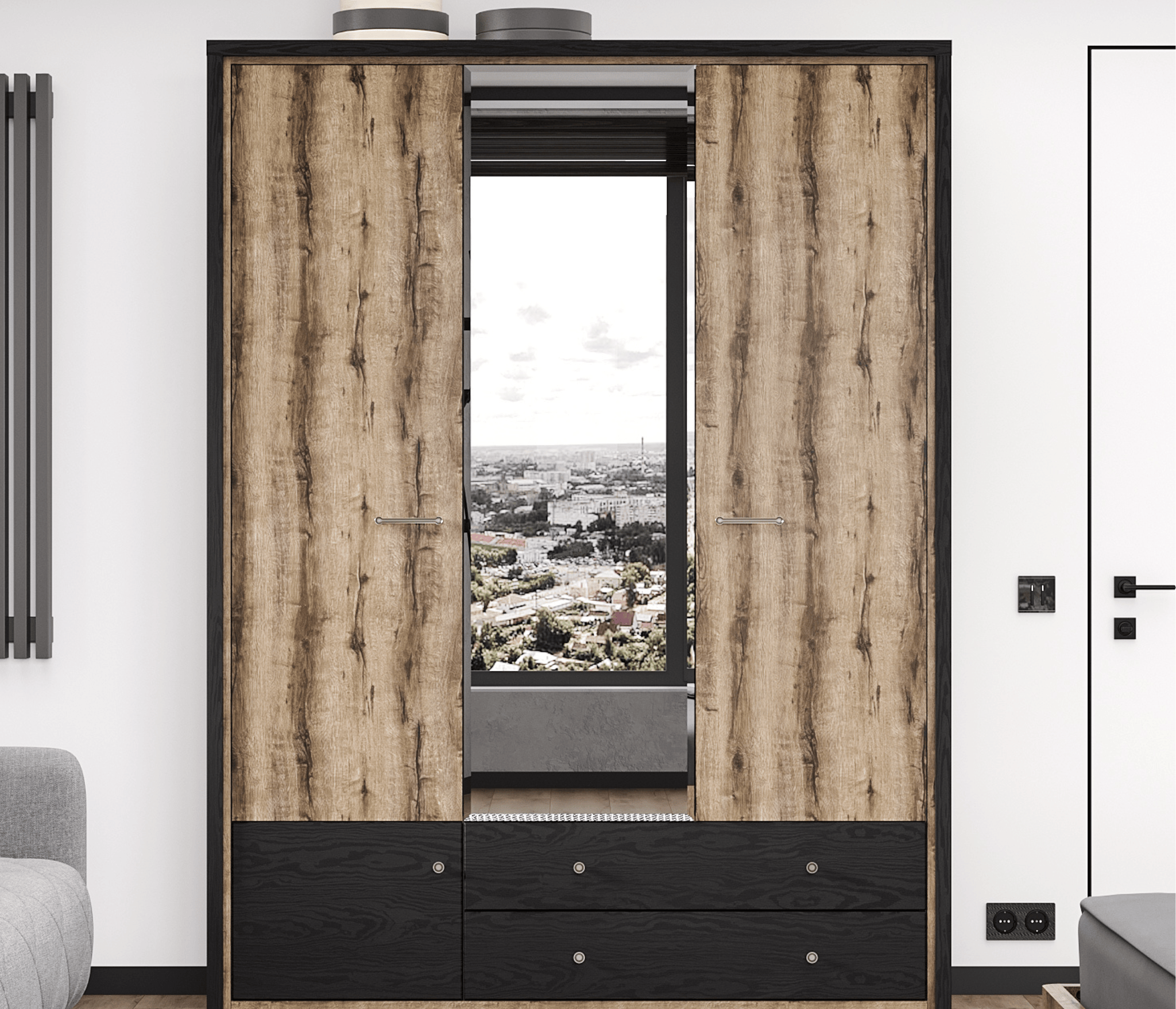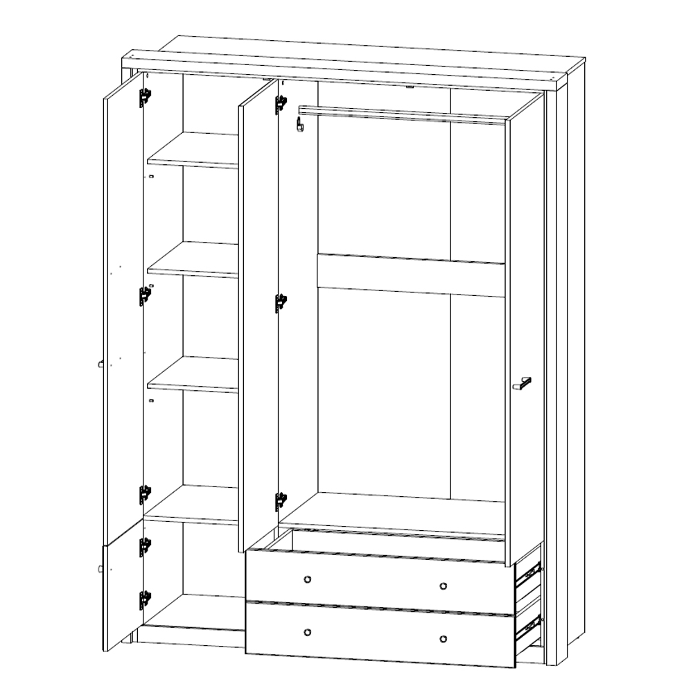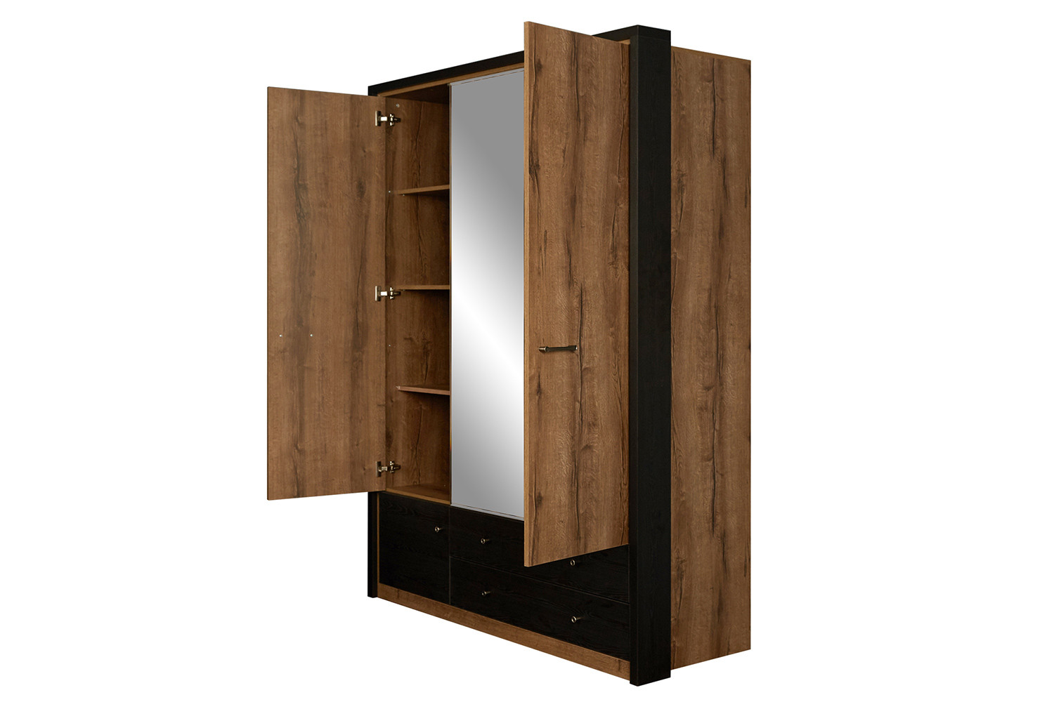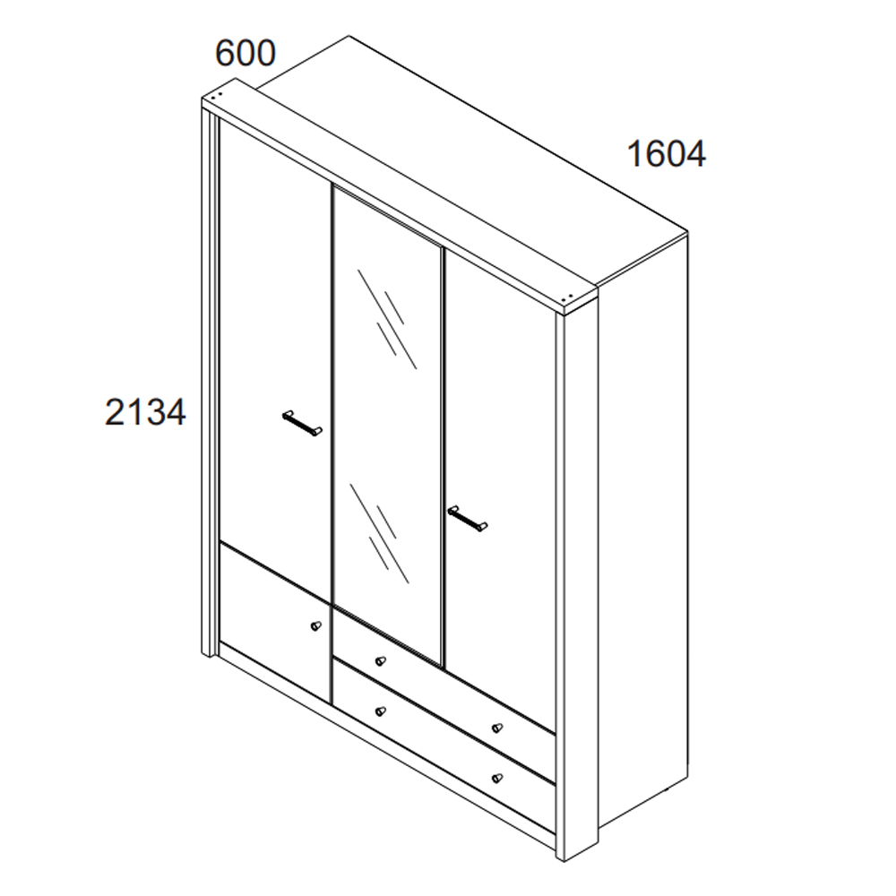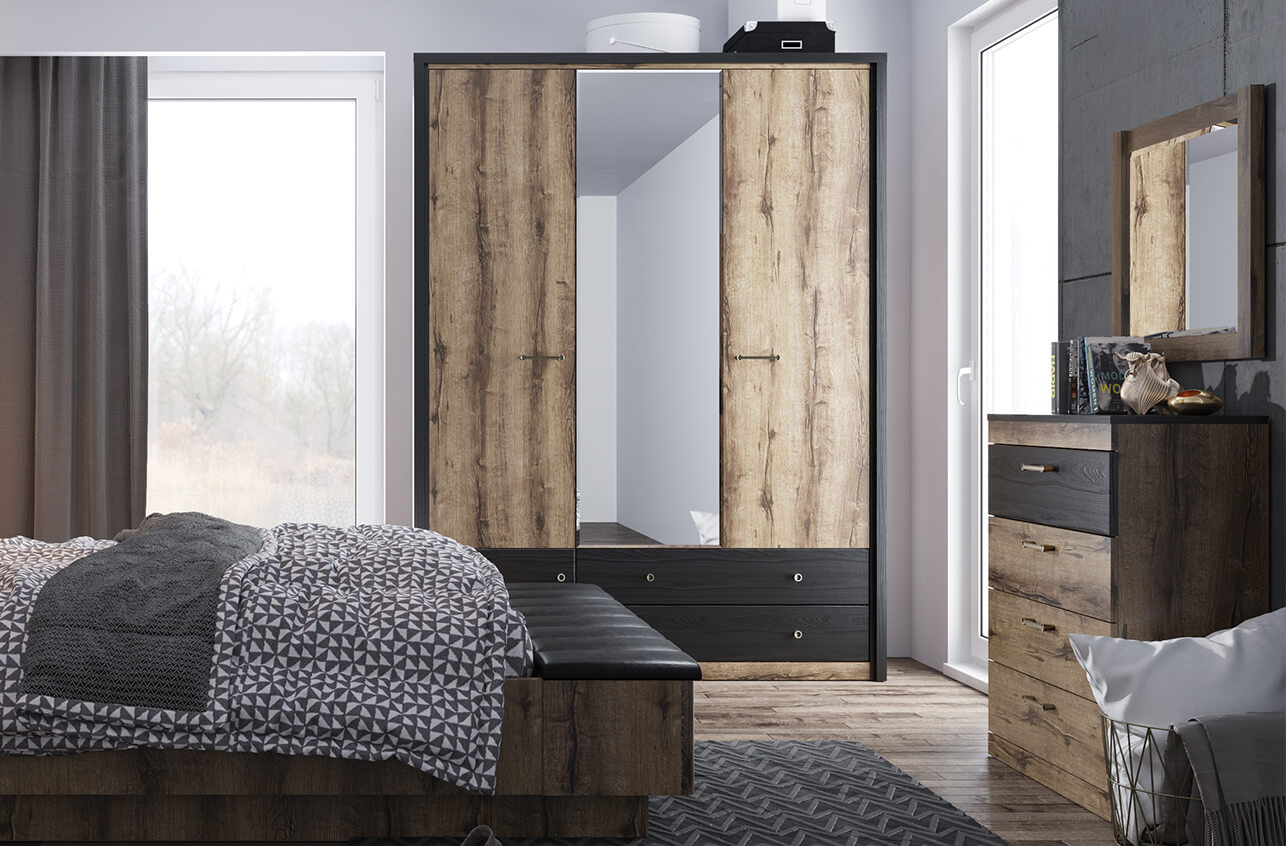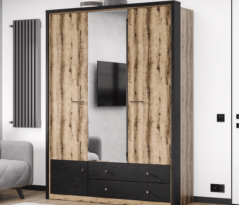 Шкаф Джаггер 3DG2SZ – это смелое и оригинальное решение для интерьера спальни в современном стиле. Контрастное сочетание цветов – дуб Монастырский и чёрный – добавляет элементу неординарный характер, а также один оттенок подчёркивает уникальность другого. Шкаф Джаггер 3DG2SN прямой. Конструкция элемента представляет собой одно гардеробное отделение со штангой за двумя глухими дверями, одно отделение с полками за глухой дверью, два выдвижных ящика (2S). Двери распашные, крепятся на петли к боковому корпусу и внутренним перегородкам. На средней двери снаружи крепится зеркало (Z). В изделии используется декоративная накладка в чёрном цвете. Основные характеристики: -цвет – дуб Монастырский (16 мм) и чёрный (18 мм); -корпус, фасады, полки переставные – ЛДСП; -использование декоративной накладки в изделии (состоит из соединения плит «Ивацевичдрев» (РБ), чёрный – 16 мм и «Egger» (Австрия), чёрный – 18 мм); -шариковые направляющие полного выдвижения GTV (Польша); -петли с доводчиками GTV (Польша); -метал. ручки.