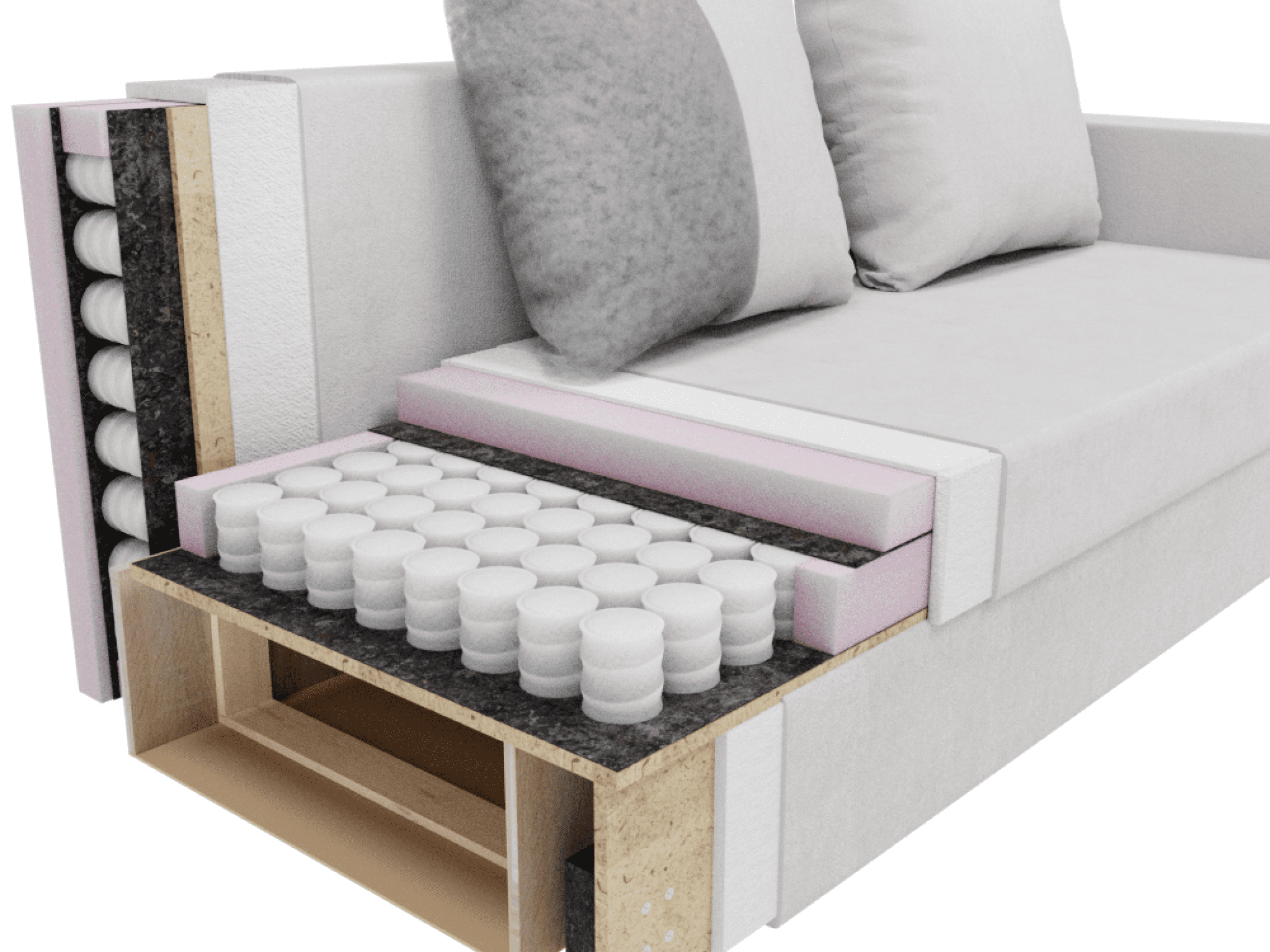 Материал каркаса дивана-кровати изготовлен из ДВП, ЛДСП и массива дерева, что обеспечивает прочность и долговечность. Наполнитель выполнен из пенополиуретана, что делает диван мягким и удобным для сидения.