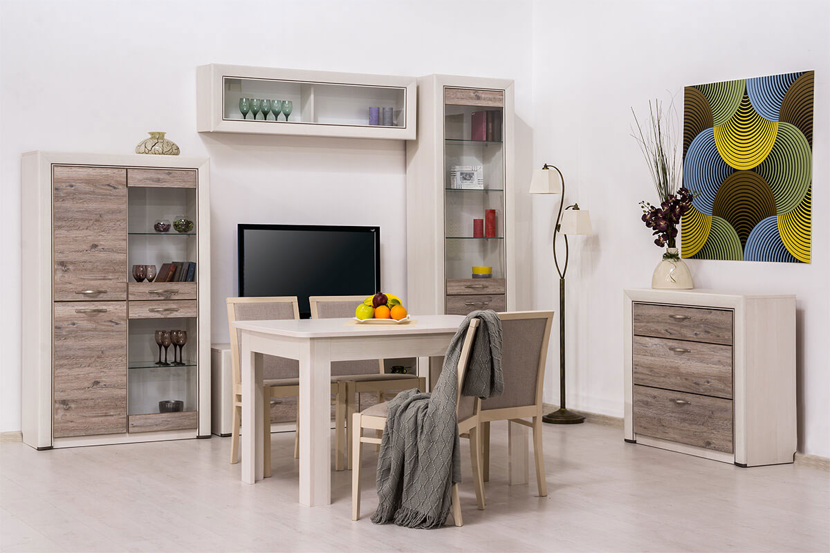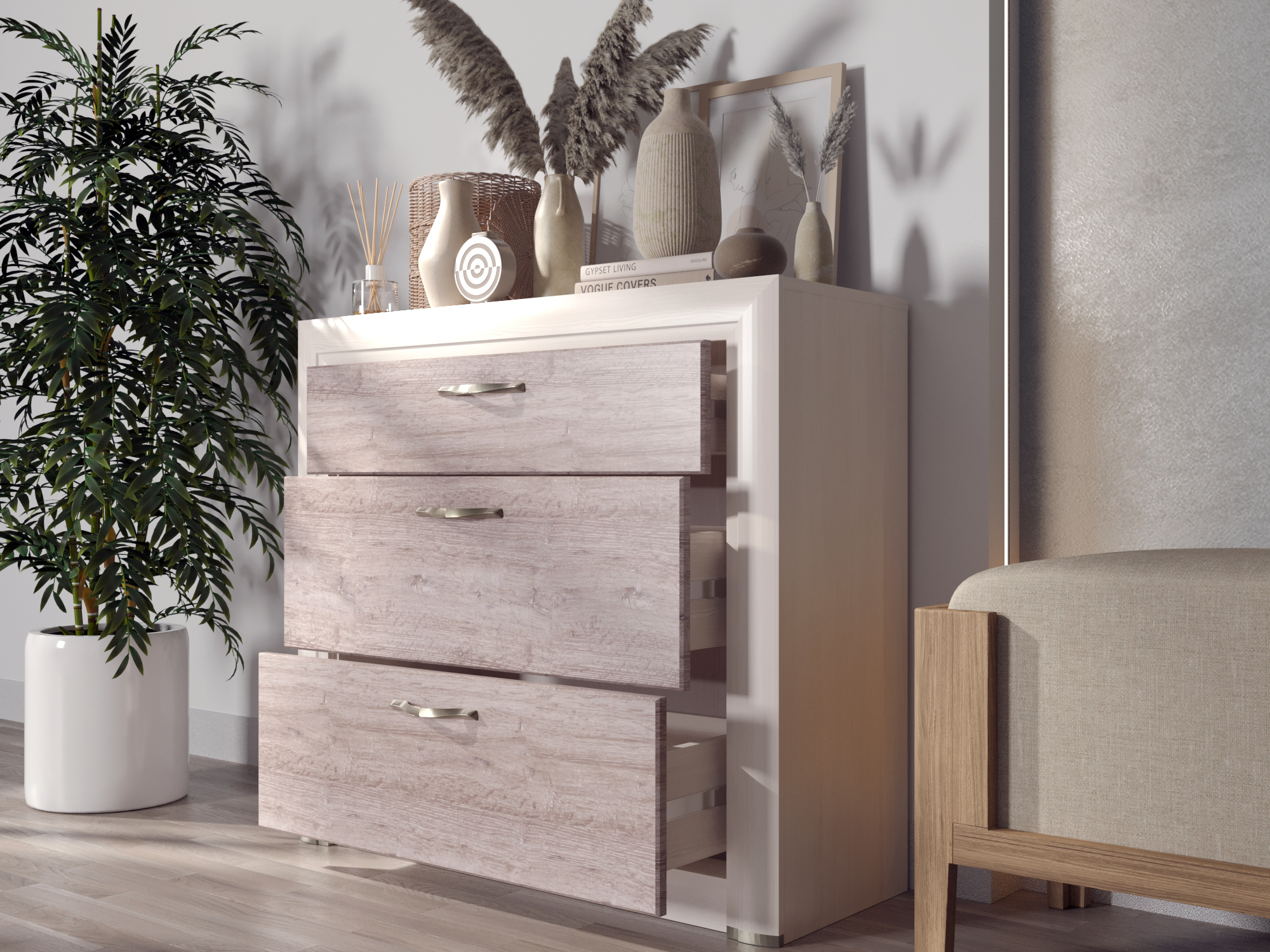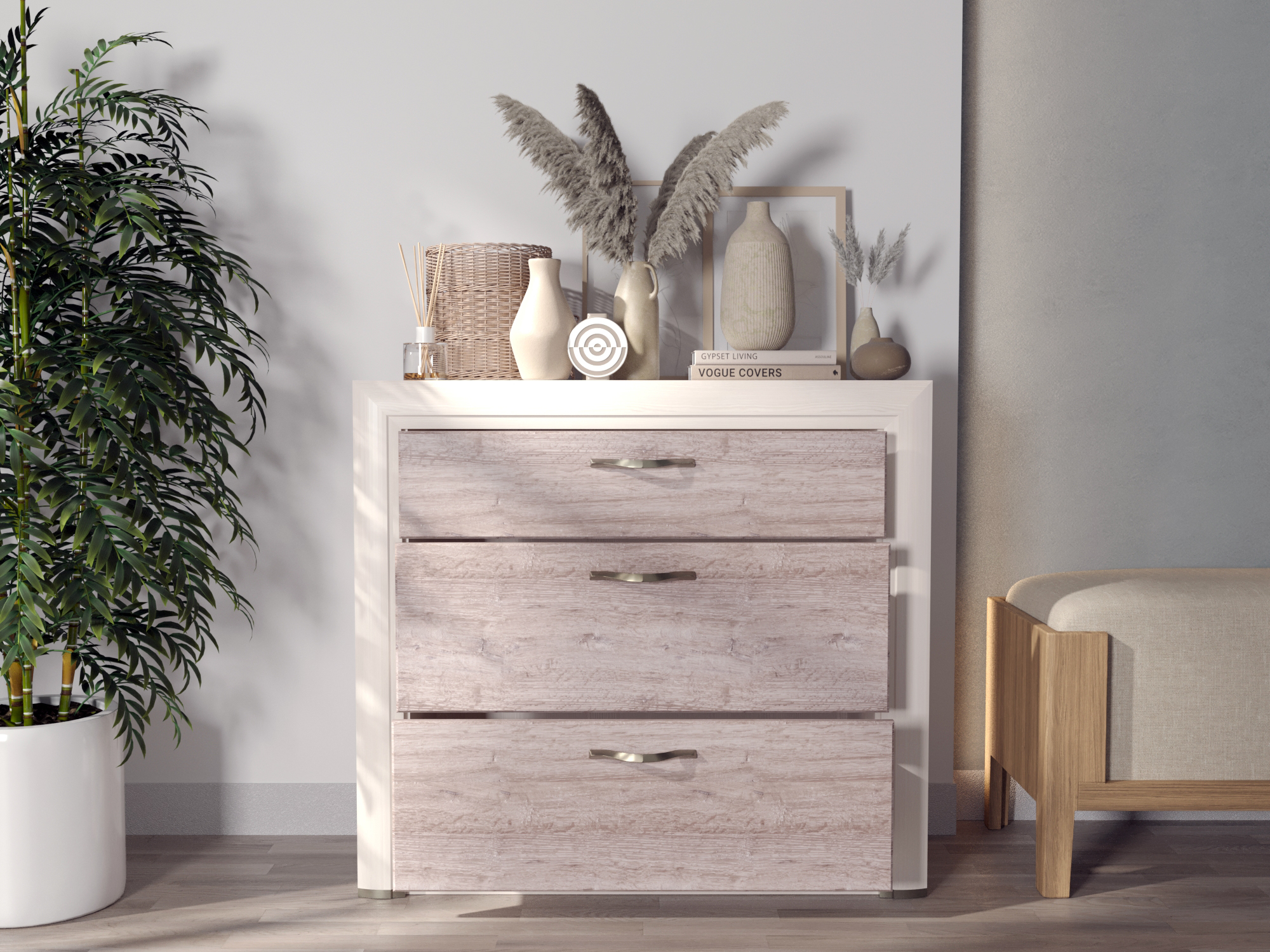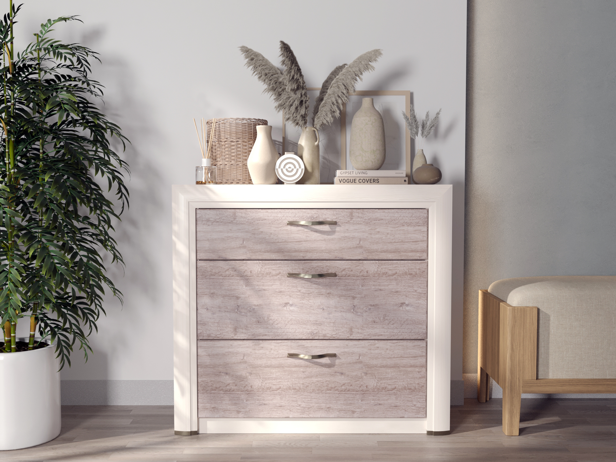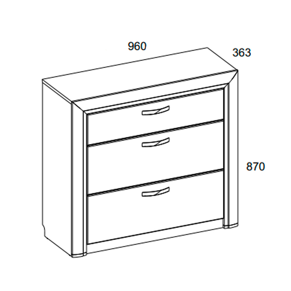 Комод Оливия 3S - необходимый предмет мебели для организации интерьера спальни и молодёжной комнаты. Является функциональным и прекрасным дополнением в обыгрывании с другими модулями коллекции Оливия, так как глубина элемента – 360 мм (возможно оформление туалетного стола с зеркалом (ширина 960 мм)). Комод 3S состоит из трёх выдвижных ящиков (3S) для хранения белья и предметов одежды (верхний ящик неглубокий, средний и нижний ящики – глубокие). Основные характеристики: -фасад - ЛДСП (18 мм), цвет – Дуб анкона; -дизайнерские декоративные планки с патиной (МДФ); -металлические ручки (сплав цинка и алюминия); -шариковые направляющие полного выдвижения.