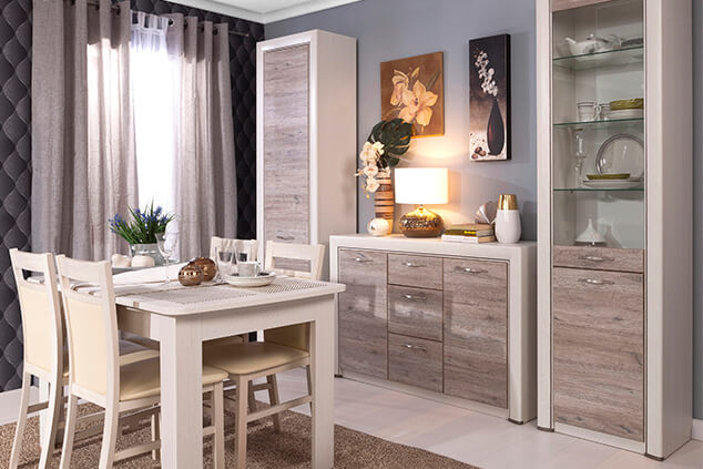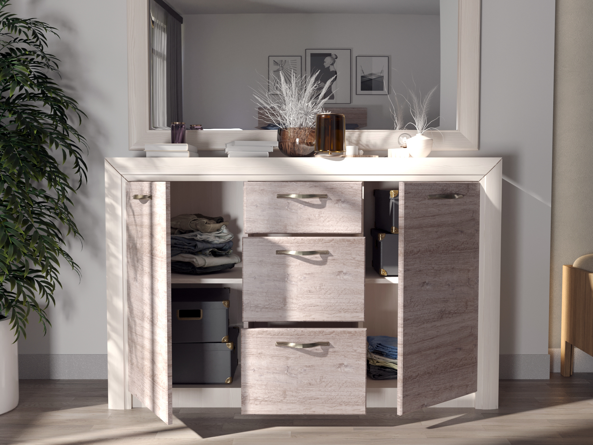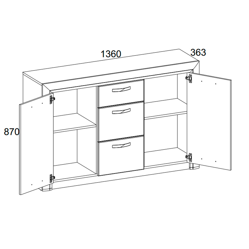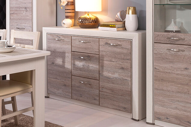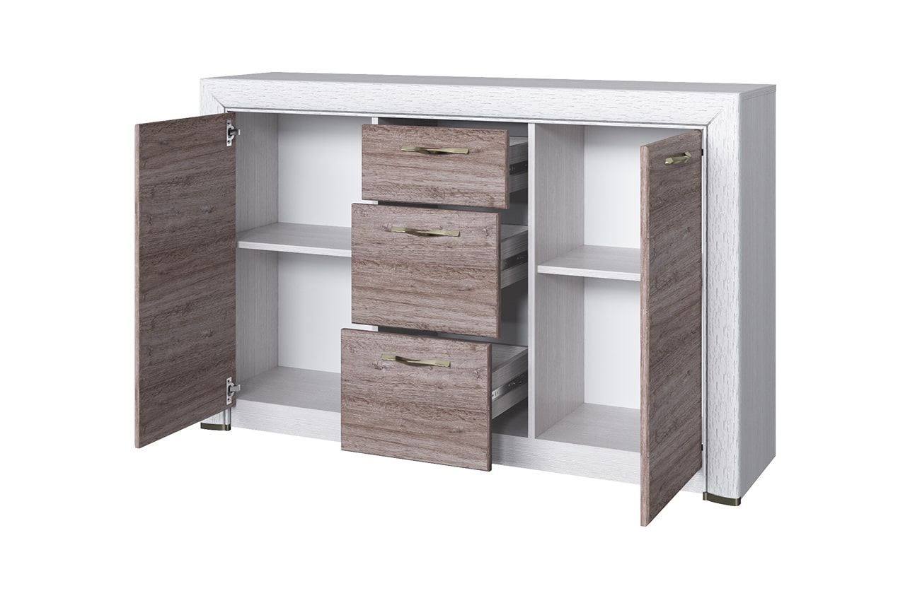 Тумба Оливия 2D3S достойно проявляет себя в оформлении интерьера гостиной, спальни, прихожей, столовой как отдельный элемент, так и в комбинировании с другими модулями коллекции Оливия (возможно оформление туалетного стола с зеркалом B (ширина 1361 мм)). Тумба 2D3S - прямая. Имеет два отделения с нишами за глухими дверями (2D) для хранения предметов одежды, посуды и других вещей, которые должны быть скрыты, три выдвижных ящика (3S) (верхний ящик неглубокий, средний и нижний ящики – глубокие). Дверцы распашные, крепятся на петли к боковинам. Основные характеристики: -фасад - ЛДСП (18 мм), цвет – Дуб анкона; -дизайнерские декоративные планки с патиной (МДФ); -металлические ручки (сплав цинка и алюминия); -шариковые направляющие полного выдвижения; -за глухой дверью одна полка.