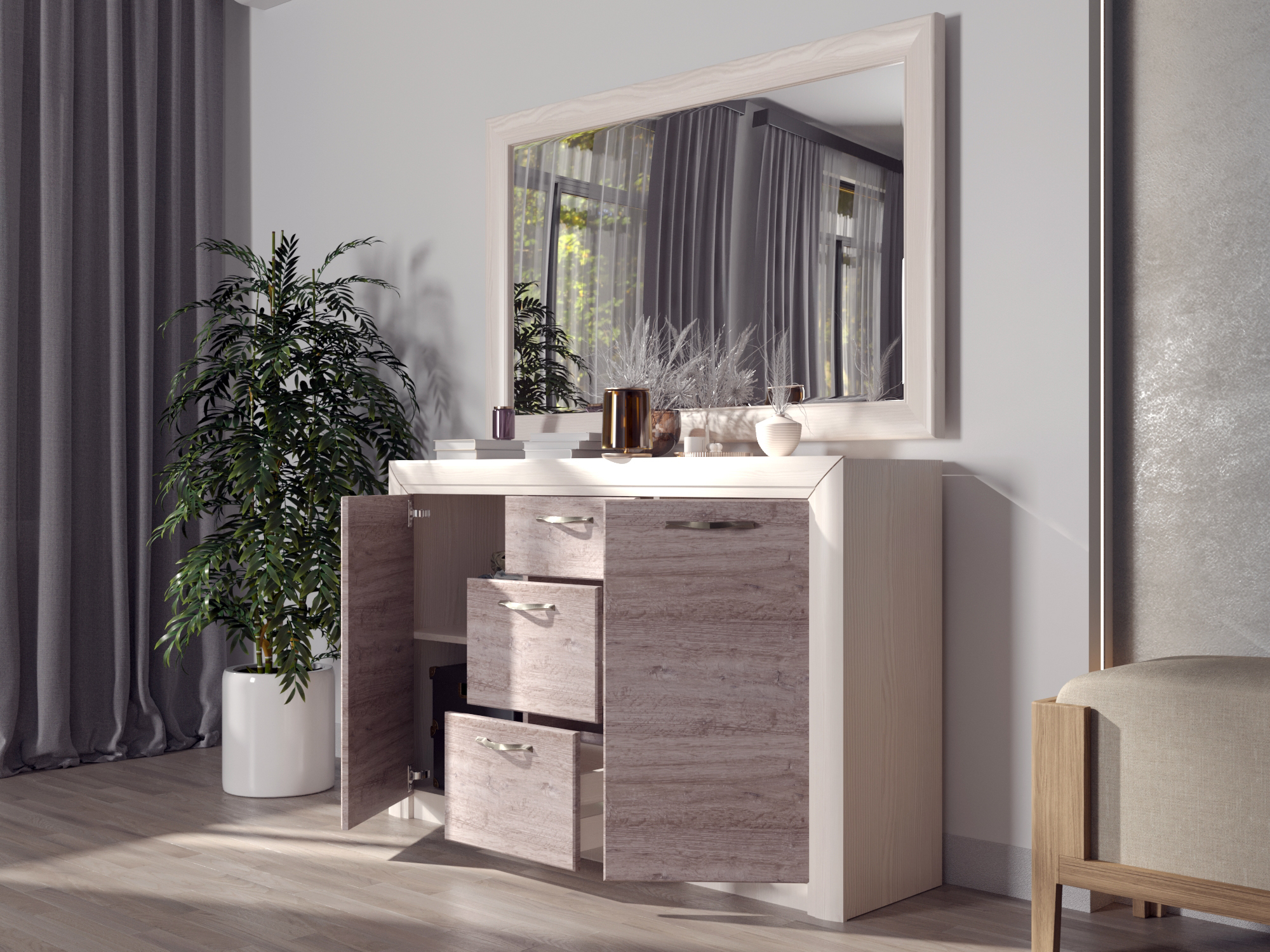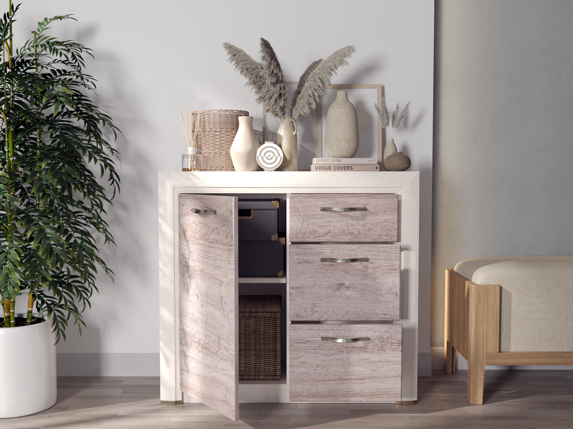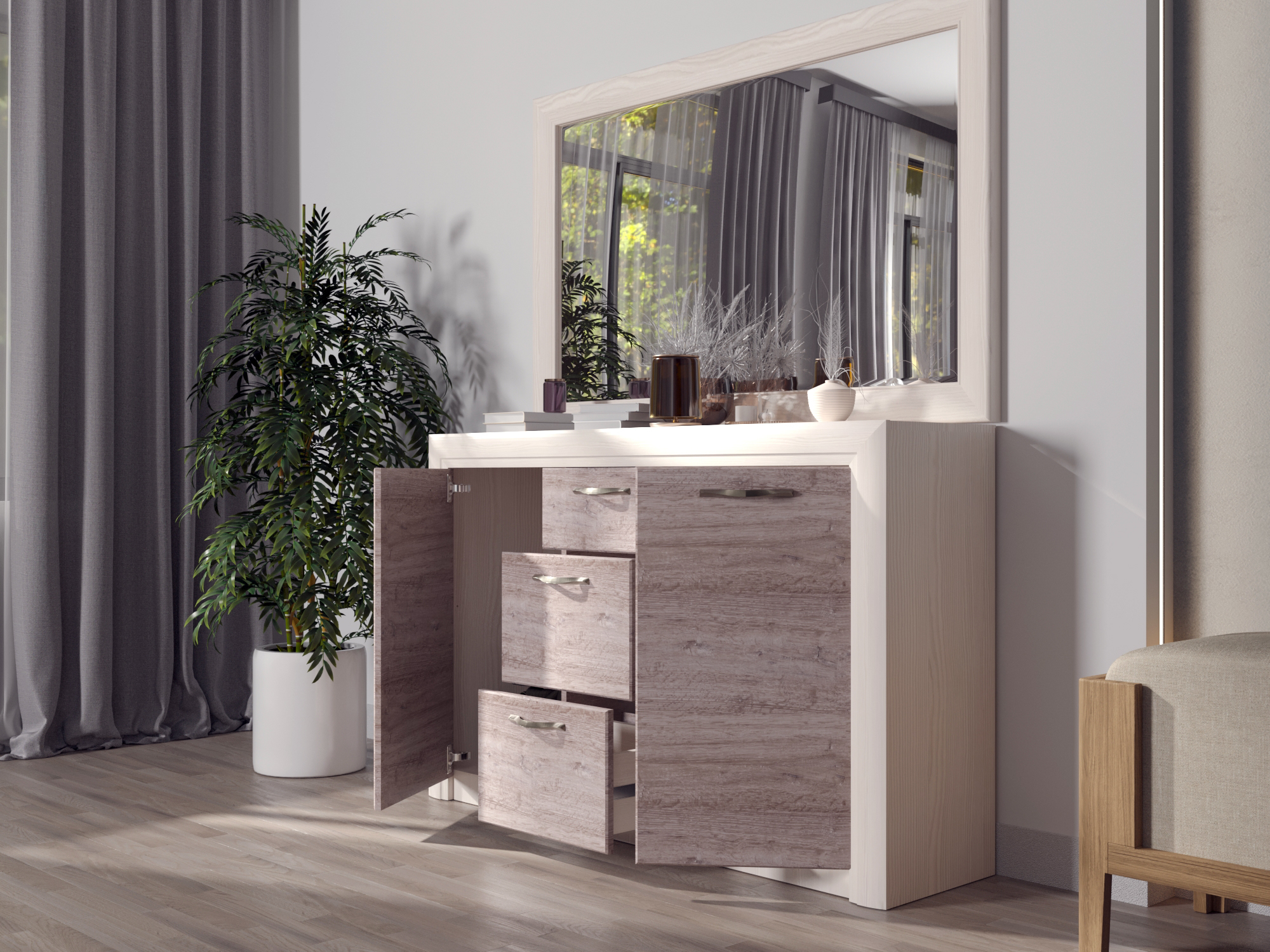 Тумба Оливия 2D3S достойно проявляет себя в оформлении интерьера гостиной, спальни, прихожей, столовой как отдельный элемент, так и в комбинировании с другими модулями коллекции Оливия (возможно оформление туалетного стола с зеркалом B (ширина 1361 мм)). Тумба 2D3S - прямая. Имеет два отделения с нишами за глухими дверями (2D) для хранения предметов одежды, посуды и других вещей, которые должны быть скрыты, три выдвижных ящика (3S) (верхний ящик неглубокий, средний и нижний ящики – глубокие). Дверцы распашные, крепятся на петли к боковинам. Основные характеристики: -фасад - ЛДСП (18 мм), цвет – Дуб анкона; -дизайнерские декоративные планки с патиной (МДФ); -металлические ручки (сплав цинка и алюминия); -шариковые направляющие полного выдвижения; -за глухой дверью одна полка.
