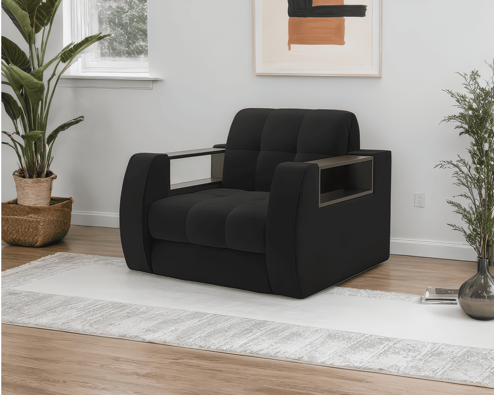 Особенностью модели являются функциональные подлокотники-полки, выполненные из ЛДСП цвета темного Венге, размером 57 × 14 см. Кресло-кровать «Барон №3» со встроенными полками в подлокотниках позволяет хранить все необходимое в одном месте, например: пульт от телевизора, наушники, зарядное устройство.