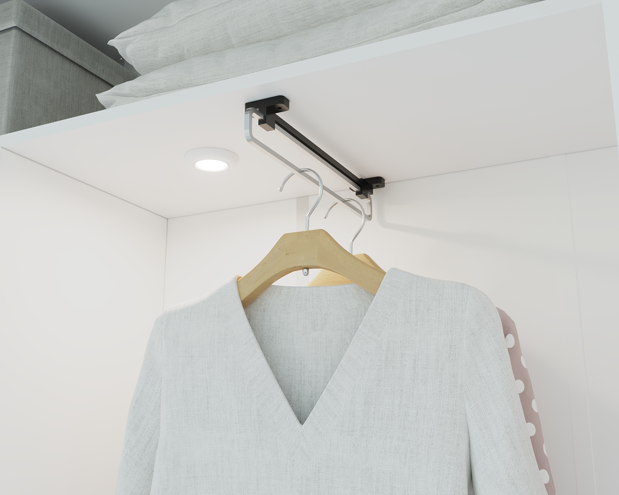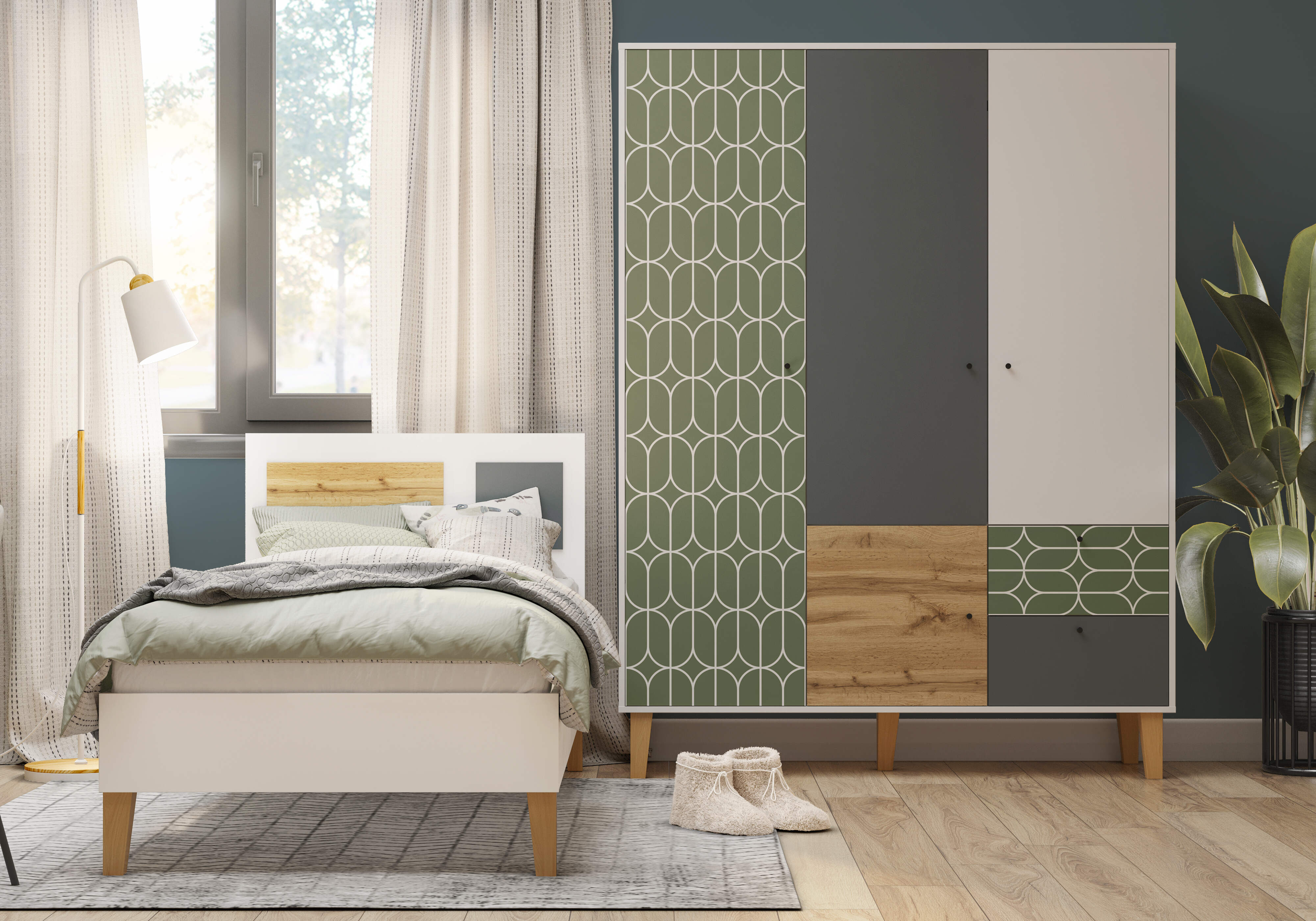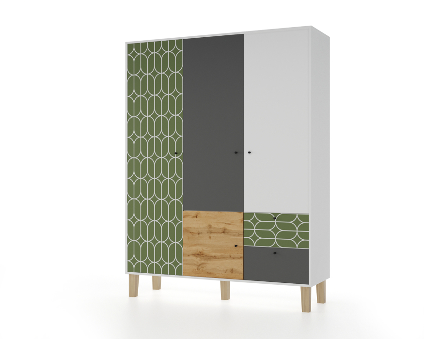 Трехстворчатые распашные шкафы серии STORY содержат три отделения. В одной части шкафа расположены вместительные полки, в другой штанга для одежды, внизу отделение с дверцей и два выдвижных ящика.