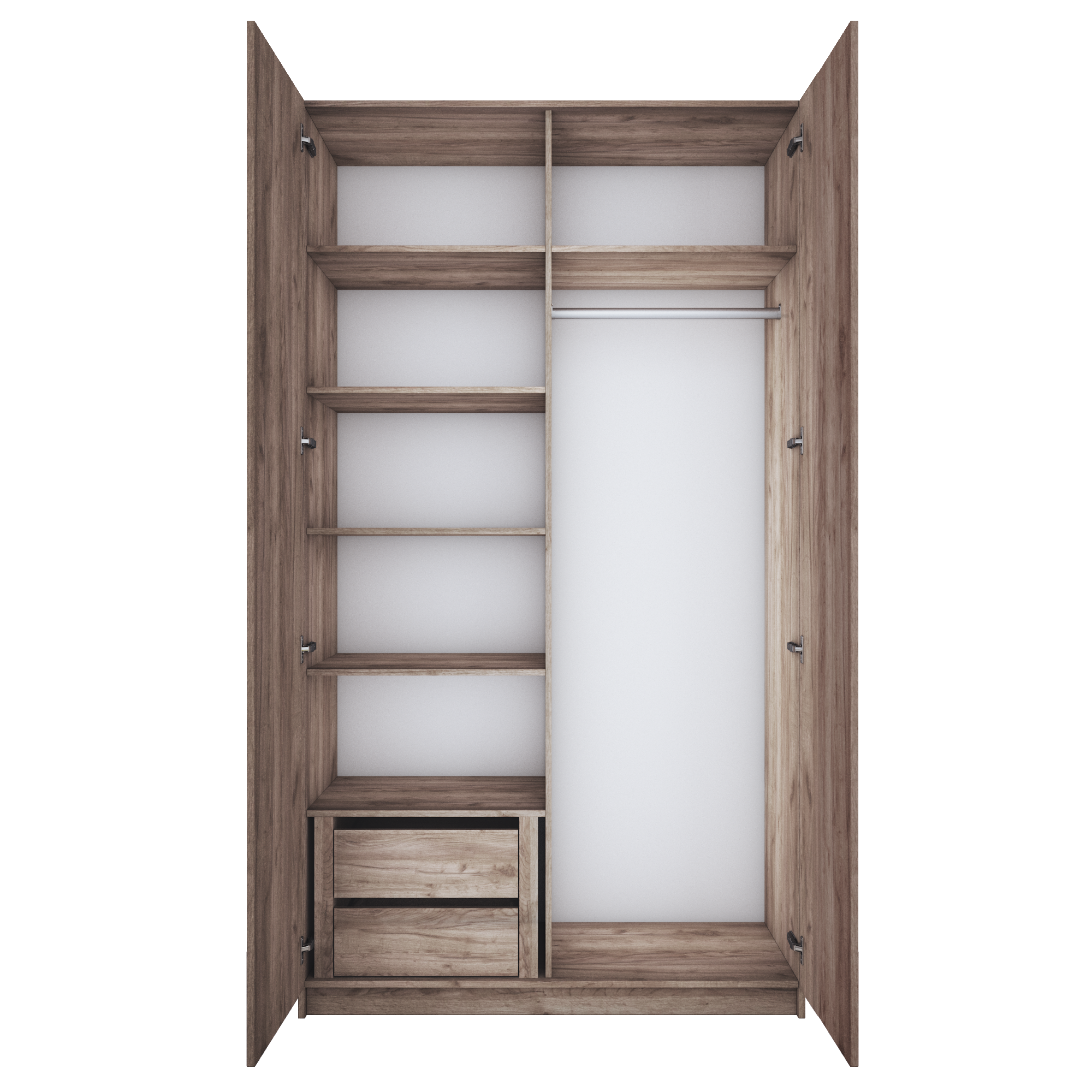Благодаря надежным полкодержателям - штифтам, полки шкафа могут выдерживать до 15 кг, штанга выдерживает нагрузку до 60 кг. Вы сможете убрать сезонные вещи, постельное белье на верхние полки. Распашной шкаф оснащен долговечной, ударостойкой кромкой ПВХ, которая защищает его торцы от сколов и повреждений, что обеспечит вам комфортное и долгое использование гардероба. Распашная система дверей Titus B-Type обеспечивает надежное прилегание дверцы к корпусу шкафа и высокую износостойкость. Механизм не деформируется при значительных нагрузках и максимально практичен в эксплуатации. Шкаф оснащен удобной минималистичной ручкой, изготовленной из алюминия. В производстве используется безопасное ЛДСП международного класса Е1, что способствует безопасному использованию на протяжении всего срока эксплуатации.