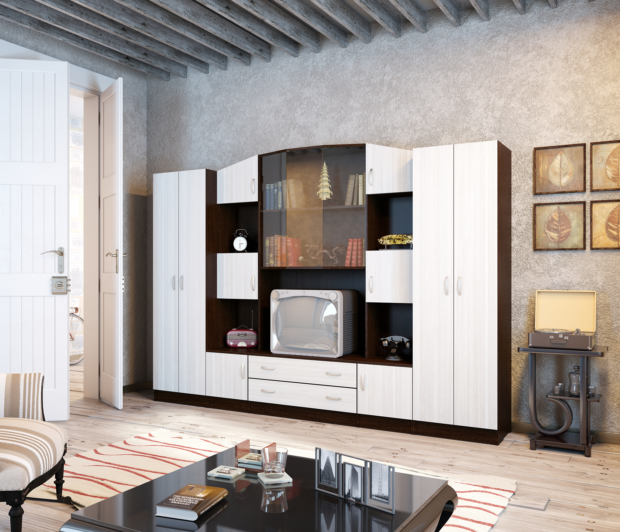 Гостиная Макарена -нестареющая классика. Контрастное сочетание темного корпуса и светлого фасада, функциональность и эффектные изгибы нашли место в сердцах наших покупателей. Стенка состоит из платяного шкафа с выдвижной штангой, центрального модуля с витриной для посуды и бельевого шкафа. Корпус: ЛДСП венге, фасад: ЛДСП сосна лоредо. Размер стенки (ШхВхГ): 280х200х42см