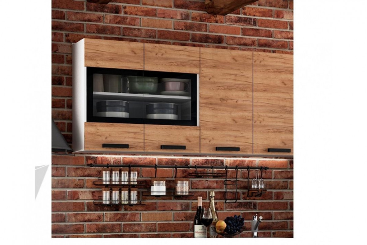 Готовое решение "Крафт" представлено корпусом в белом исполнении. Верхние стеклостворки фасадов украшены прозрачным стеклом в черной декоративной рамке, нанесенной при помощи фотопечати.