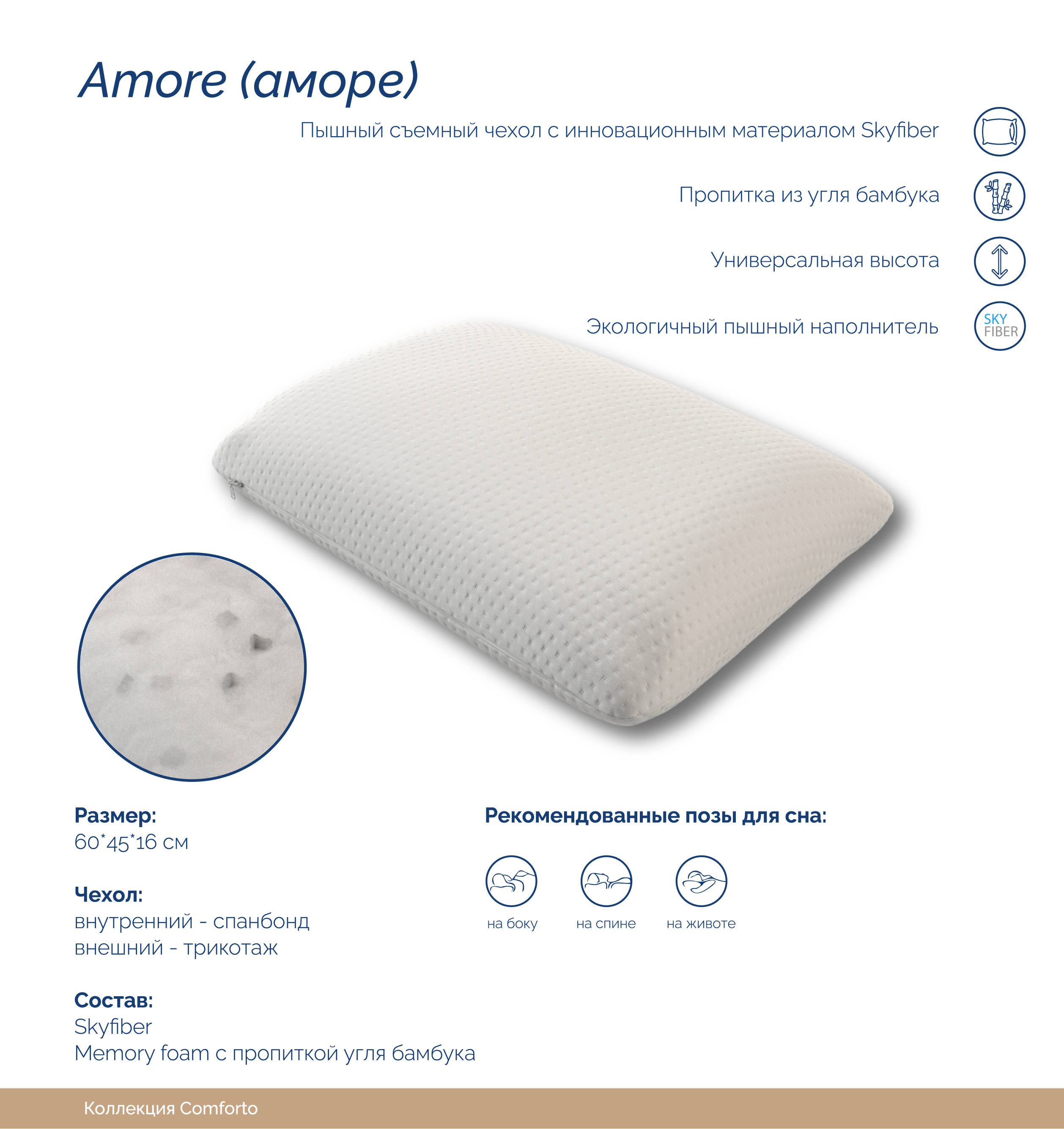 Подушки коллекции Comforto сочетают в себе классическую форму и привычный комфорт набивной подушки наряду с инновационным материалом Skyfiber. Подушки подстраиваются под анатомические особенности спящего при этом достаточно упругие, чтобы обеспечить поддержку и здоровье шейного отдела позвоночника.