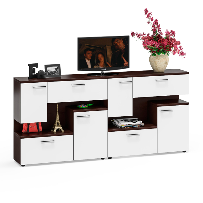 Конструктивно это две тумбы объединенные в одну широкую. Каждая тумба вместительна с четырьмя закрытыми отделениями и открытыми нишами - отличная подставка для домашнего кинотеатра. Широкий верхний горизонт тумб послужит надёжной полкой для установки телевизора любой диагонали. Для всей входящей в Ваш ТВ-комплекс техники и технологических мелочей места тоже хватит, а может и останется для других атрибутов отдыха!